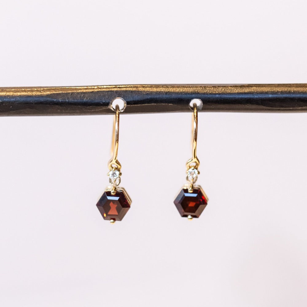 These petite drop earrings from designer Suzanne Kalan feature stunning hexagonal cut garnet gemstones in a deep, rich burgundy color, accented by tiny white diamonds, all set in bright 14 karat yellow gold. They add a touch of color to any jewelry wardrobe, perfect for day or night.