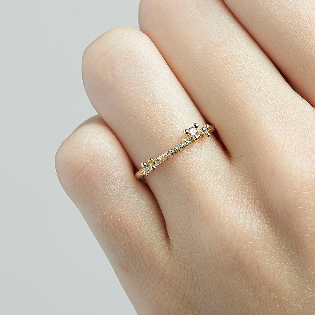 A delicate wedding band or stacking ring featuring white diamonds in two asymmetrical clusters set among granules of yellow gold on a gently textured round band.