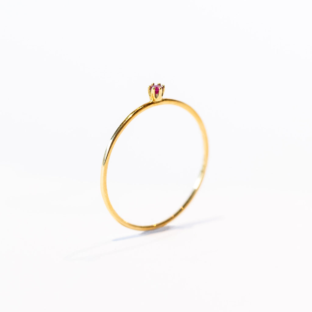 Tiny prong set ruby stacking ring in 14k yellow gold