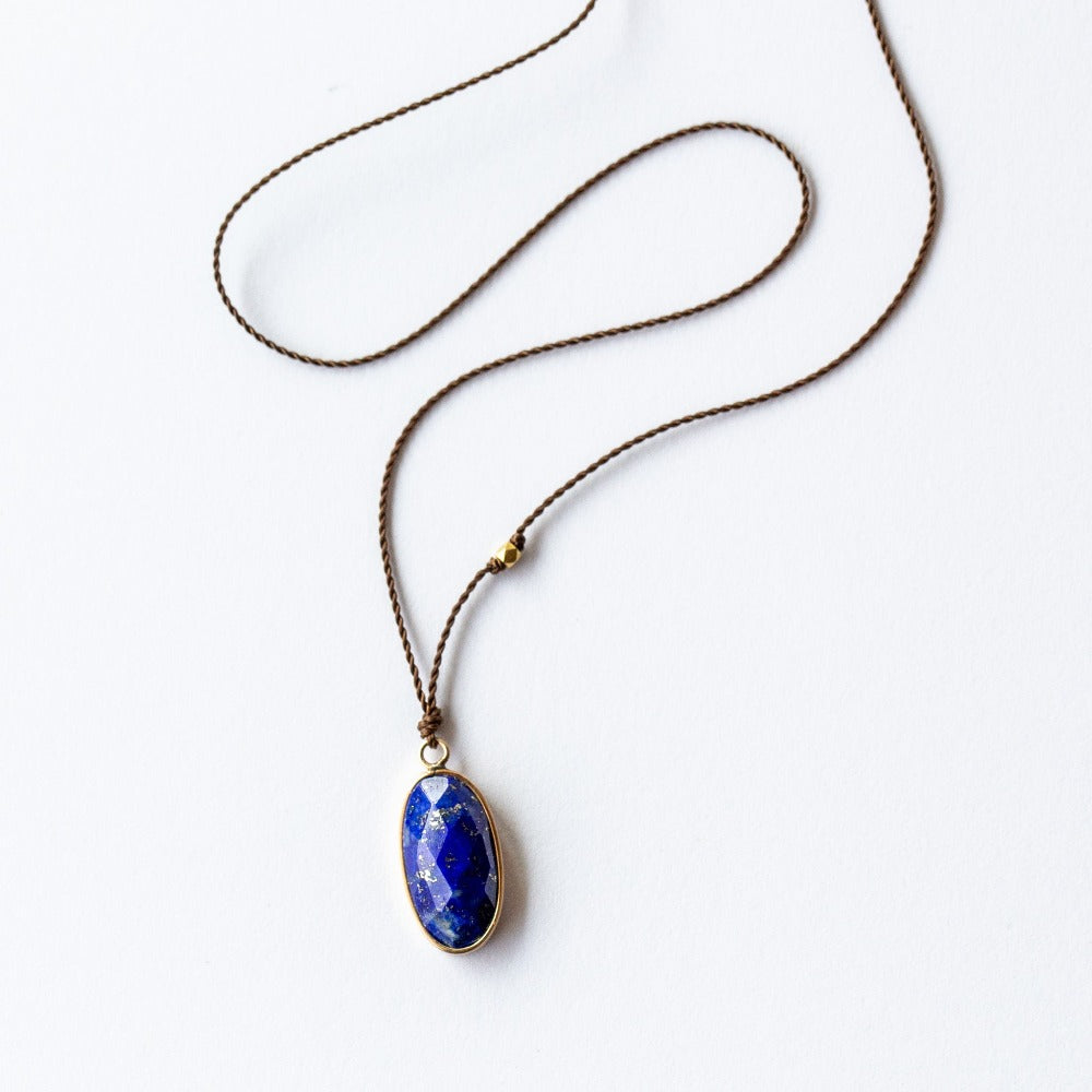 Oval faceted lapis necklace bezel set in 14k yellow gold
