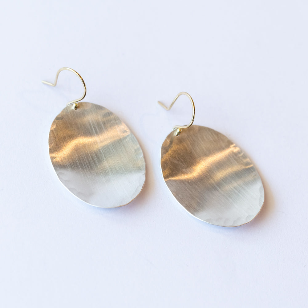 Simple, sculptural, and striking in their quiet confidence—Sarah McGuire’s Large Domed Oval Drop Earrings are proof that minimal doesn’t mean boring. Each sterling silver oval is hand-textured and gently domed to catch the light just so, giving off a soft, moonlit glow with every turn of your head.