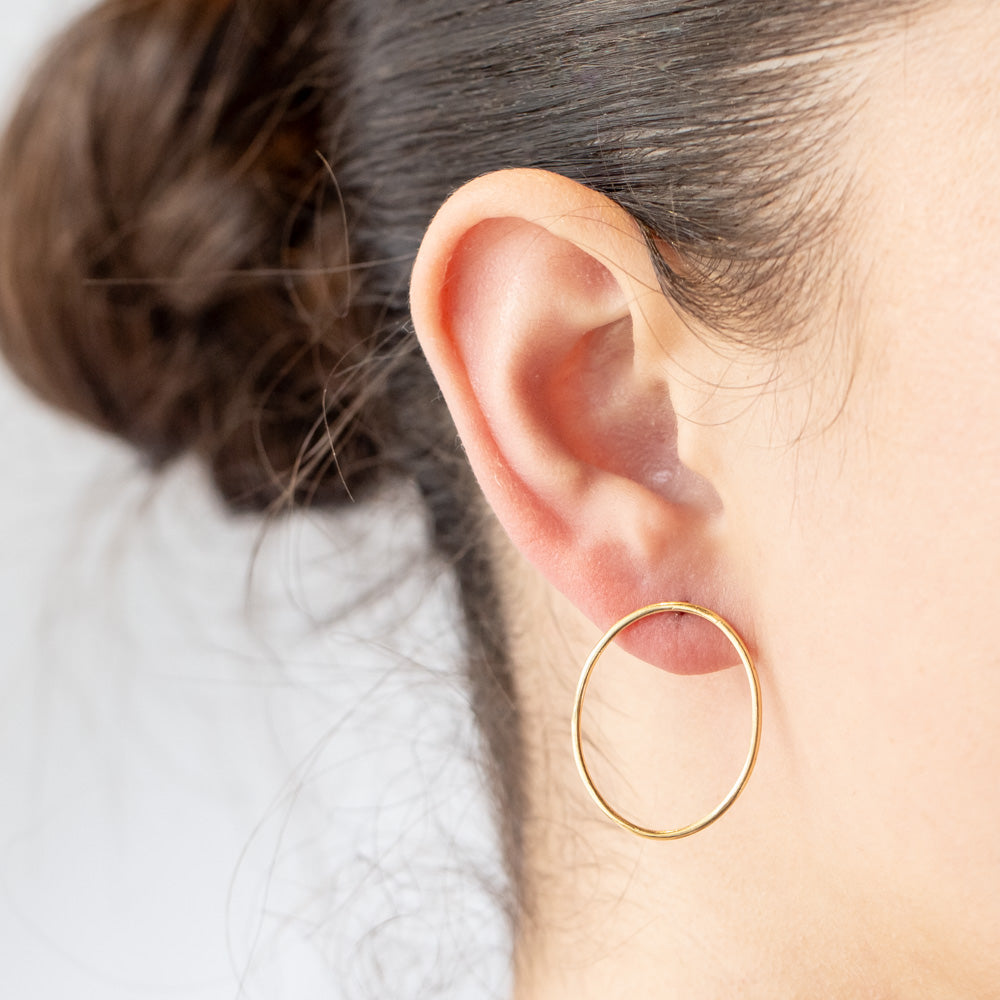 Part hoop, part stud! Page Sartisson's large oval post earrings feature smooth, solid gold open wire ovals finished with a classic post. This style is seamless, flattering, and lightweight.