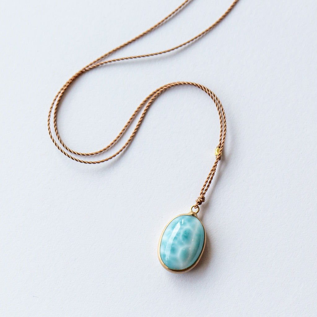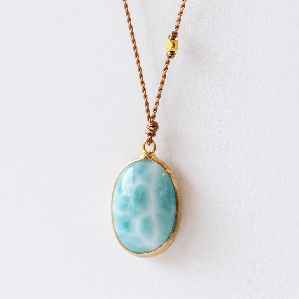 Smooth oval larimar necklace bezel set in 14k yellow gold