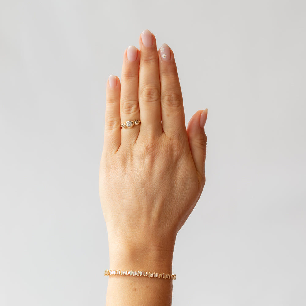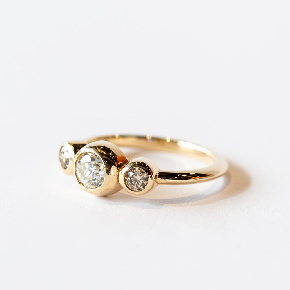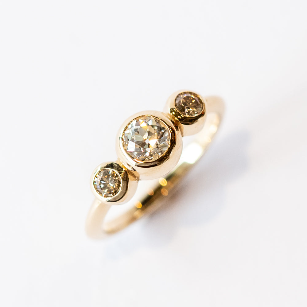 .45ct ISI1 Old European cut diamond bezel set in 14k yellow gold and flanked by .20tcw champagne side diamonds
