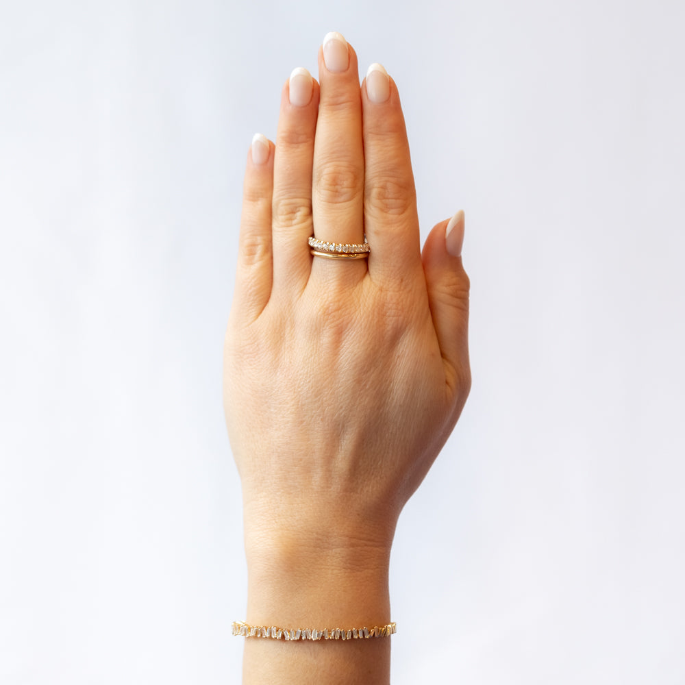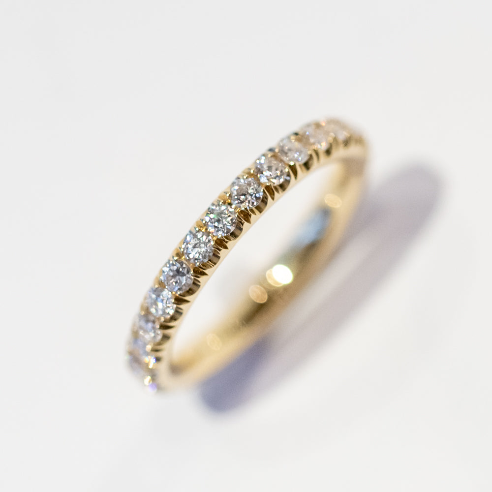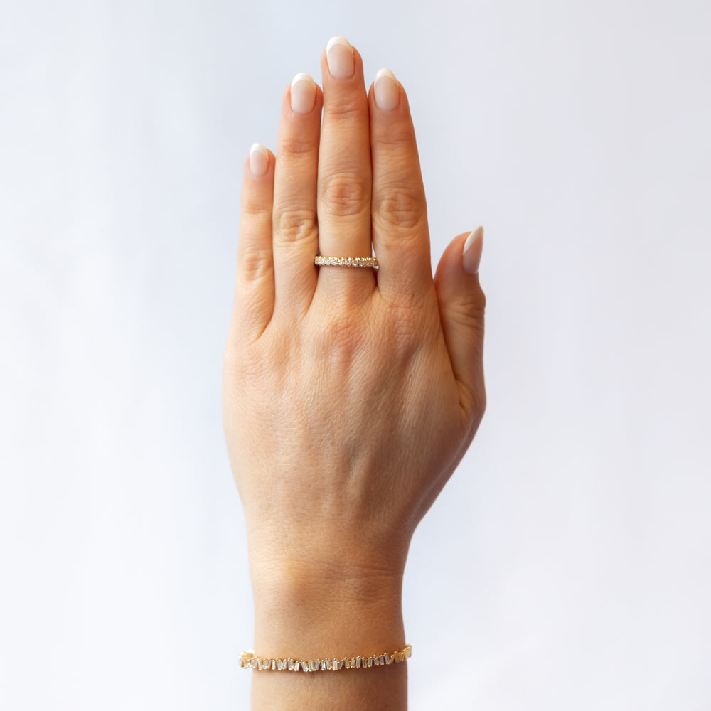 The Leda Diamond Eternity Band is what happens when timeless meets extra. Old European cut diamonds, with their signature vintage sparkle, are set in French pave prong settings, creating a seamless flow of light. All of this beauty is wrapped up in 18k yellow gold, giving it that classic yet elevated vibe that’s perfect for a wedding band—or just because. She's so sparkly we can hardly put her down.