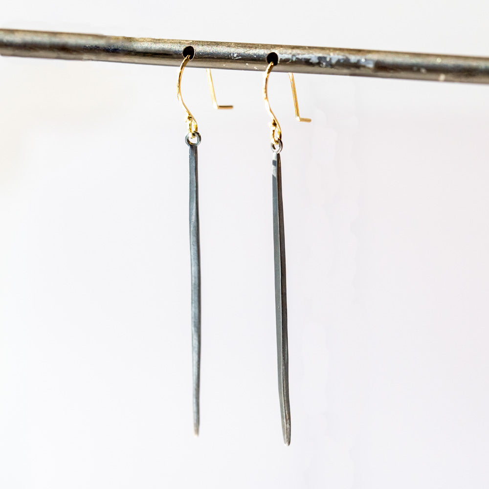 Long oxidized sterling spike earrings set on 18k yellow gold ear wires