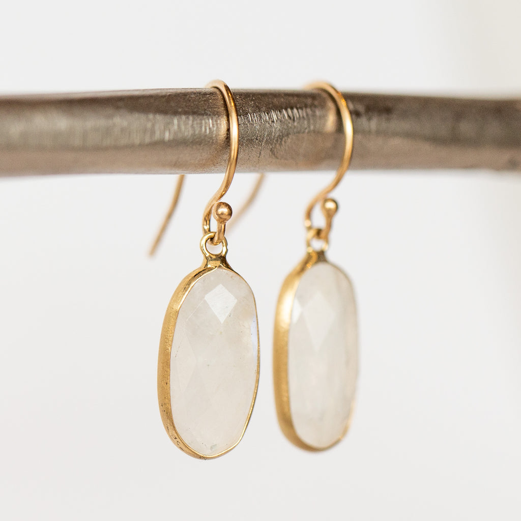 Long faceted oval moonstone drop earrings bezel set in 14k yellow gold