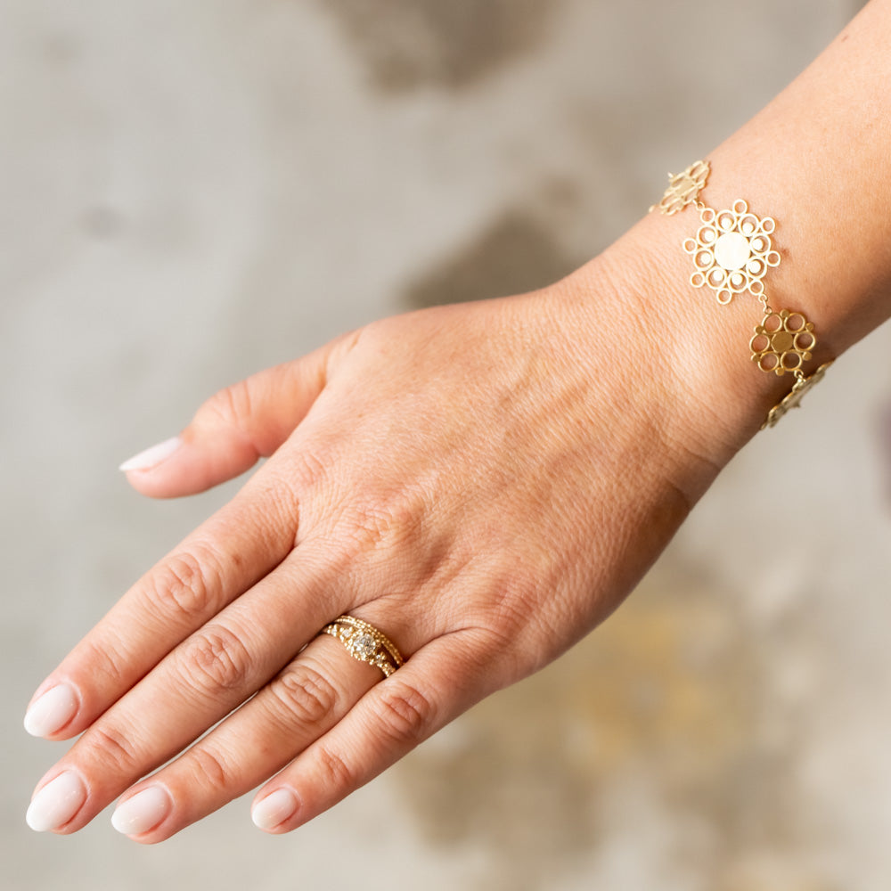 Designer Ananda Khalsa marries ancient jewelry tradition with modern sensibility in this richly detailed gold bracelet. The delicate mandalas, crafted in 18k yellow gold, are a nod to timeless symbols of spiritual harmony and balance. Each mandala is meticulously crafted with a subtly hammered matte finish, giving it a textured, organic feel that enhances its earthy yet elegant vibe. The design is both refined and meaningful, with every detail thoughtfully placed to evoke a sense of calm and centeredness.