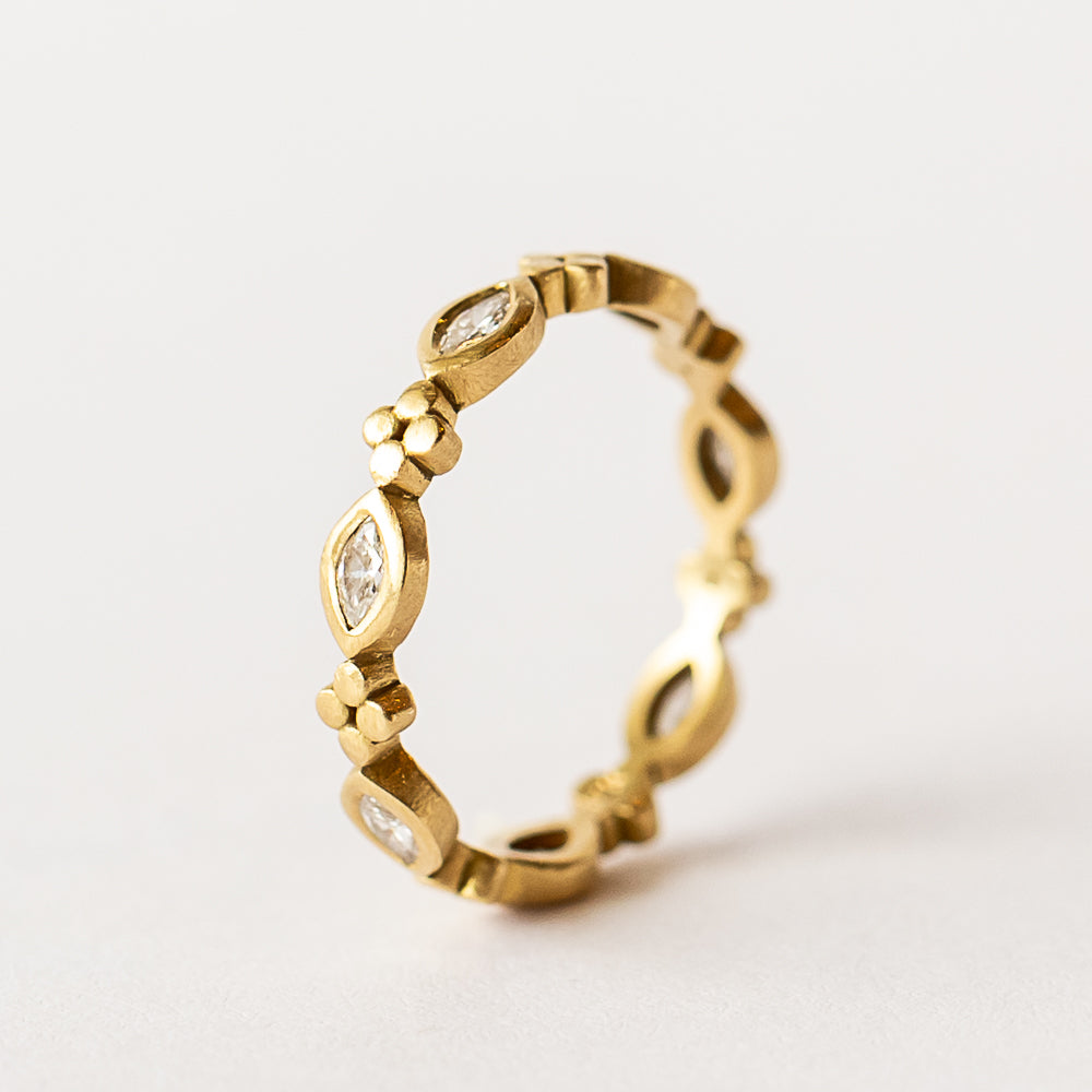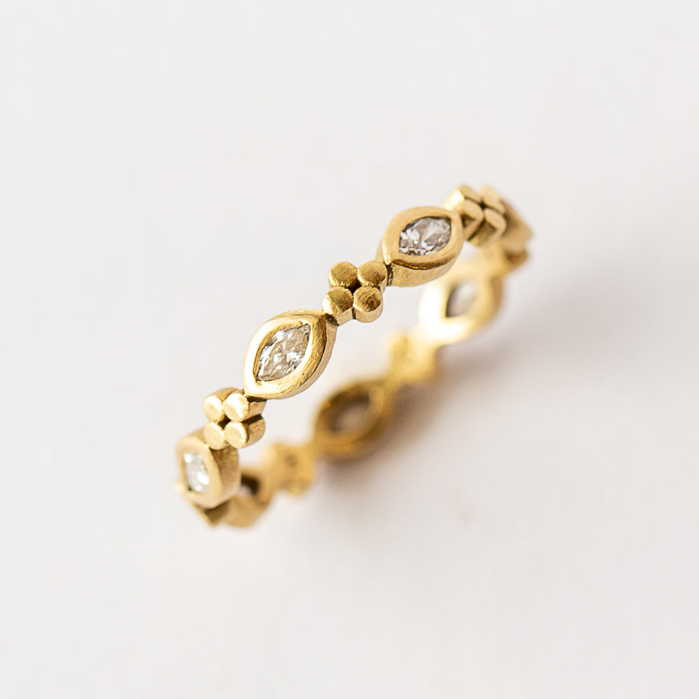 The Marquise Eternity Band brings edge to the classic diamond stacker. Sleek marquise-cut diamonds wrap the matte 18k yellow gold band, each framed with tiny golden trios that give it subtle texture and sparkle from every angle. Slim, refined, and a little unexpected—this is stacking with intention.