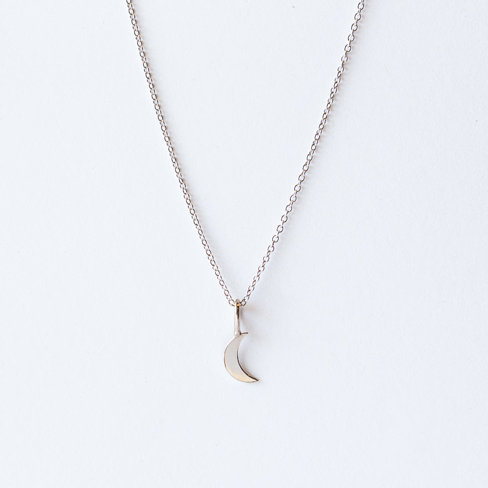 A delicate crescent moon crafted in polished 14k white gold, perfect for layering or wearing solo. Its sleek, minimalist design brings a subtle celestial touch and modern elegance to any chain or charm stack. Wear it alone for a soft accent or mix it with other charms to create a personal, everyday collection.