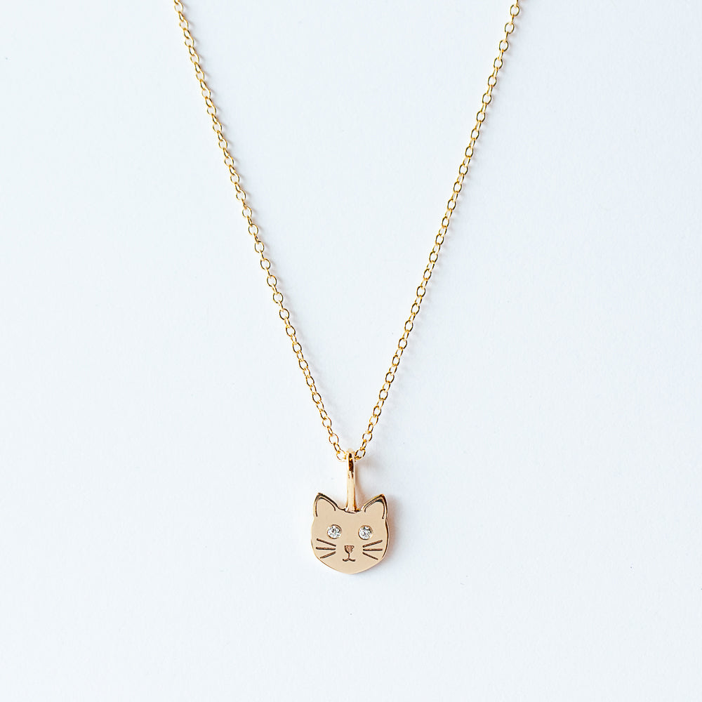 Sweet and sassy, this sweet little cat charm is the perfect way to honor your favorite floof-ball. Crafted in polished yellow gold with engraved details, this one is set with sparkling diamond eyes! Add it to your choice of chain necklace or charm bracelet.