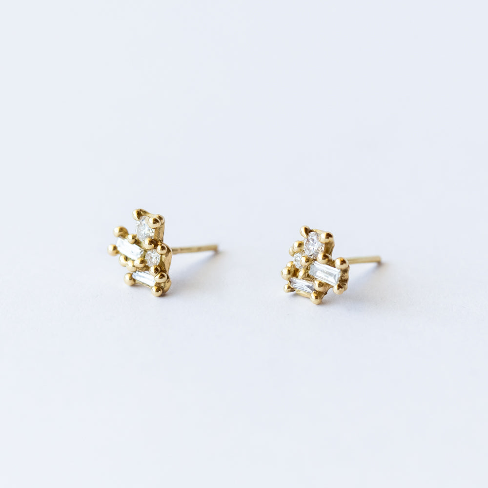 If you’re looking for a little sparkle with a twist, these mixed diamond luminous cluster stud earrings from Ruth Tomlinson are a perfect pick. Crafted in warm 14k yellow gold, each stud features a cluster of champagne baguette diamonds and brilliant white diamonds, creating a beautiful contrast of shape, sparkle, and color. The result is a pair of diamond studs that feel a bit like a vintage treasure, with just the right amount of edge.