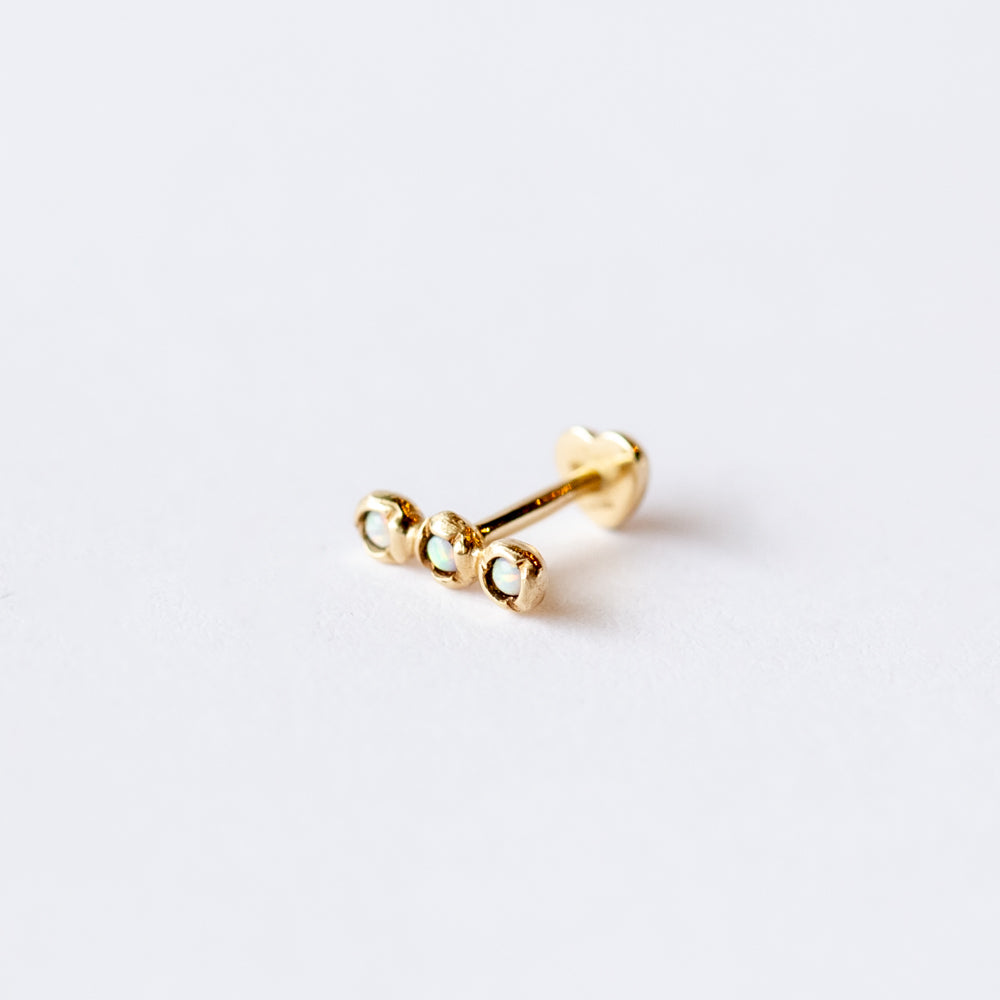 This trio of opals encased in molten bezel settings plays perfectly with the proportion of the ear, especially striking for an upper lobe piercing.