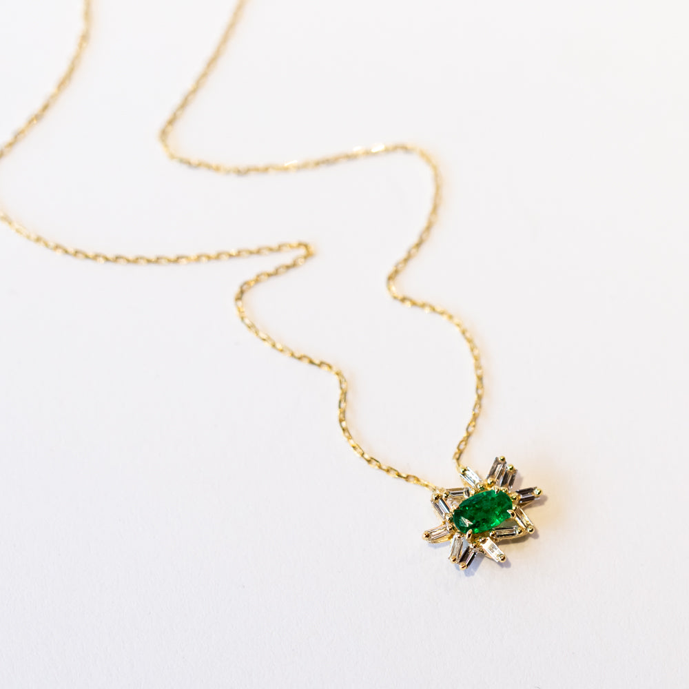 This stunning necklace is all about understated luxury with a bold pop of color. At its center, a vibrant green emerald steals the show, framed by a halo of sparkling baguette diamonds set in Suzanne Kalan's signature scattered style. Crafted in 18k yellow gold, the adjustable chain lends this women's gemstone necklace added versatility—perfect for any neckline or layering with other necklaces in your collection.