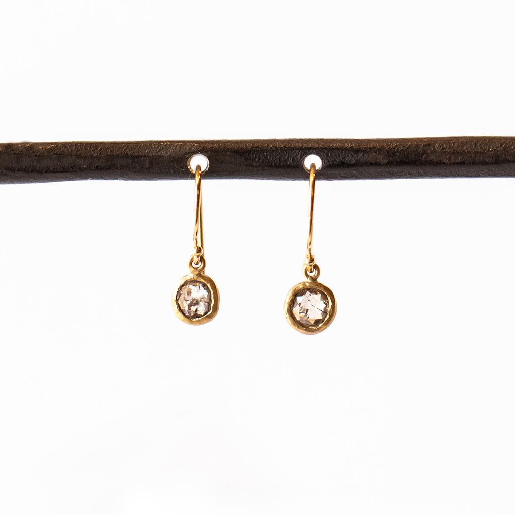 These dainty diamond drop earrings feature textured yellow gold bezels around rose cut salt and pepper diamonds.