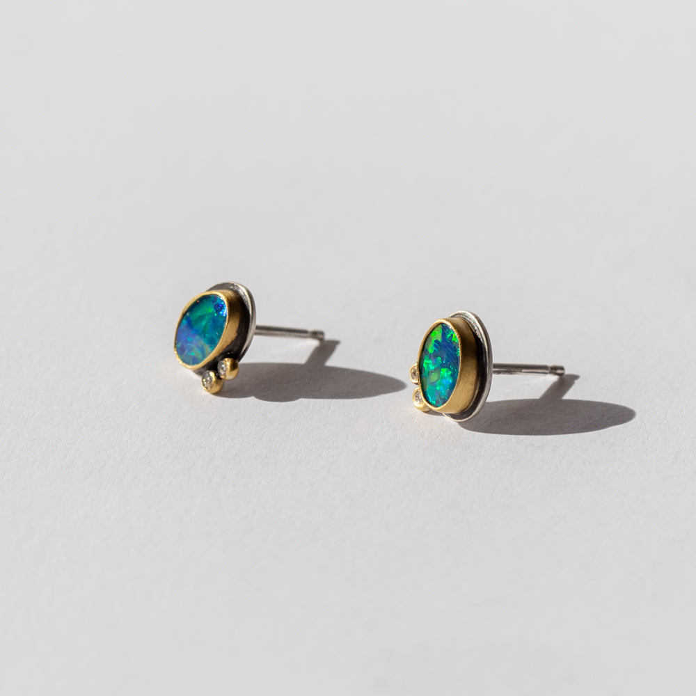 Ananda Khalsa | Oval Australian Opal Stud Earrings with Two Diamond Dots