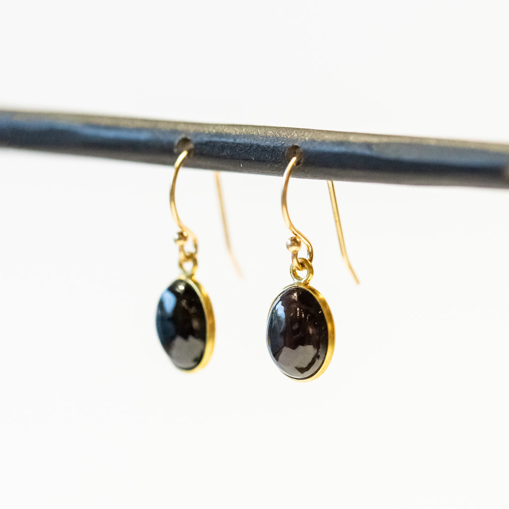 Oval cabochon black opal drop earrings bezel set in 18k yellow gold