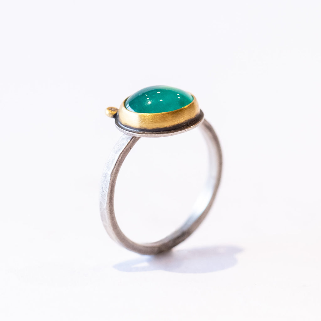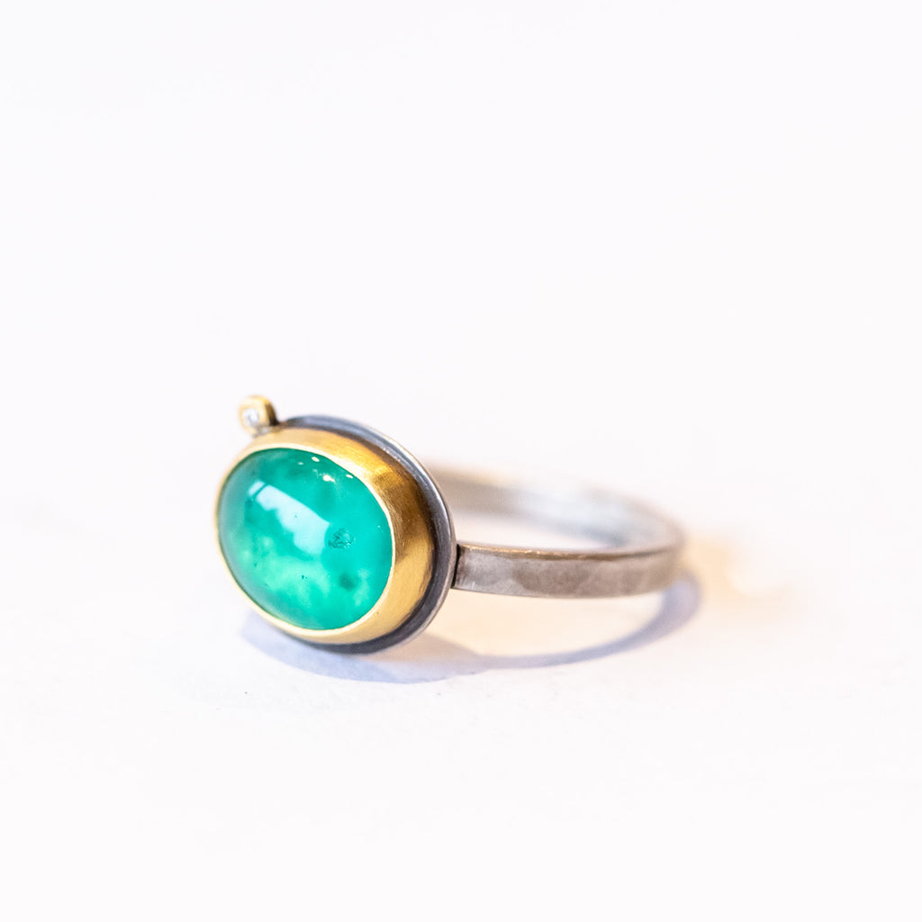 Oval cabochon gem silica ring bezel set in 22k yellow gold with diamond dot and sterling silver band