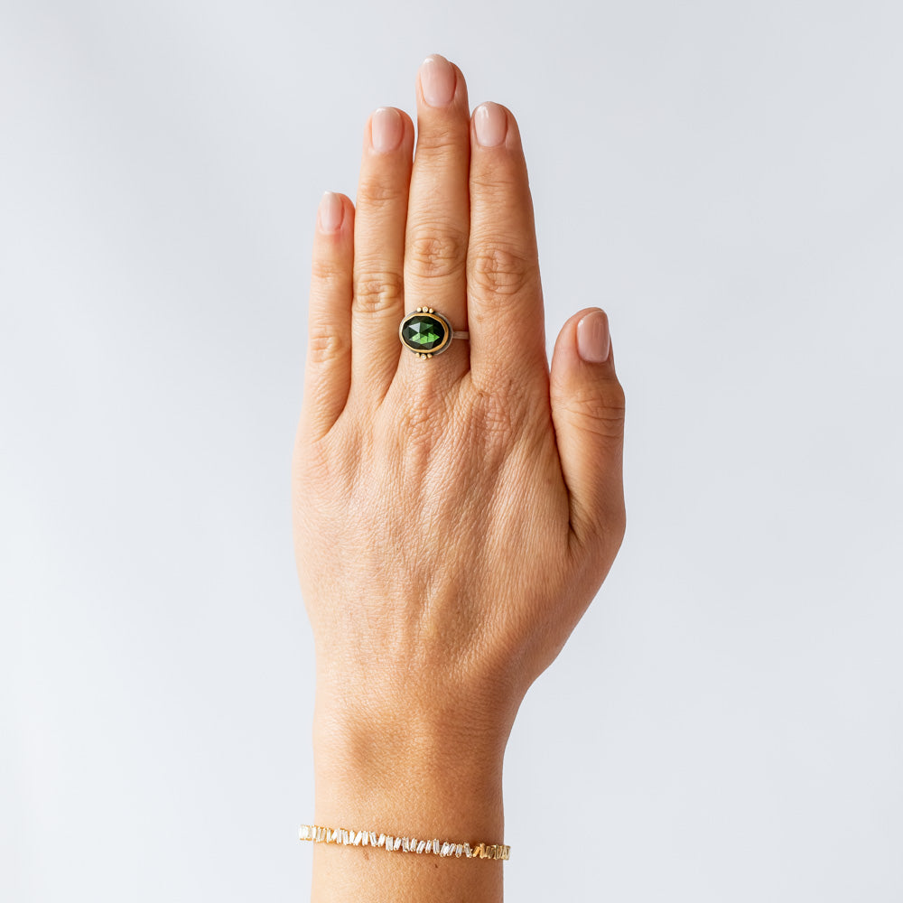 A gemstone promoting good energy, protection, self-confidence for its wearer, green tourmaline glows with a forrest-like warmth. This one-of-a-kind Ananda Khalsa gemstone ring features a deep green oval rose cut tourmaline accented by tiny diamonds and 22k yellow gold dot accents set in a sterling silver ring.