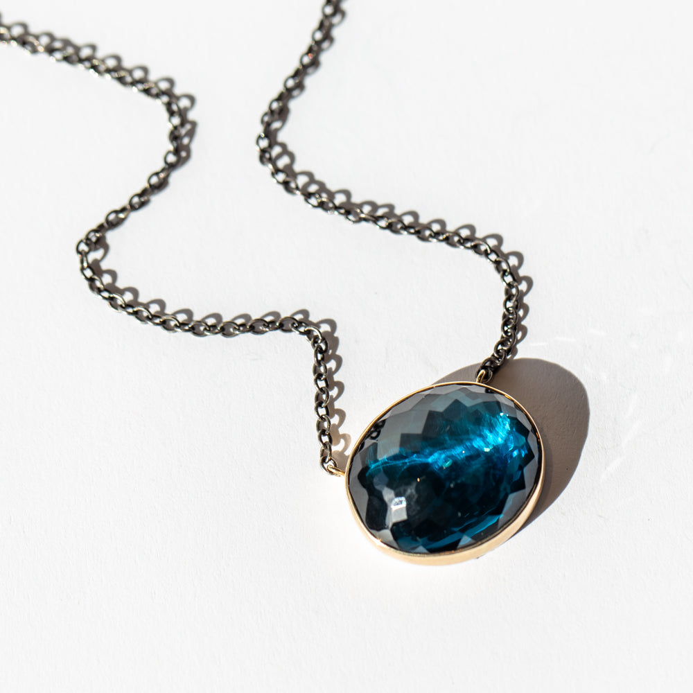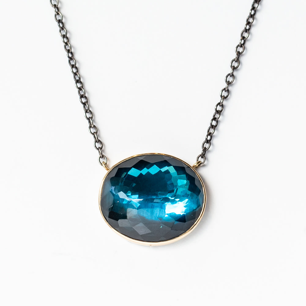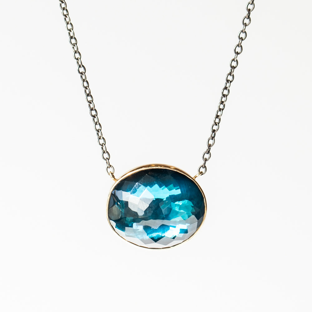 Oval rose cut London blue topaz necklace bezel set in oxidized sterling silver and 14k yellow gold
