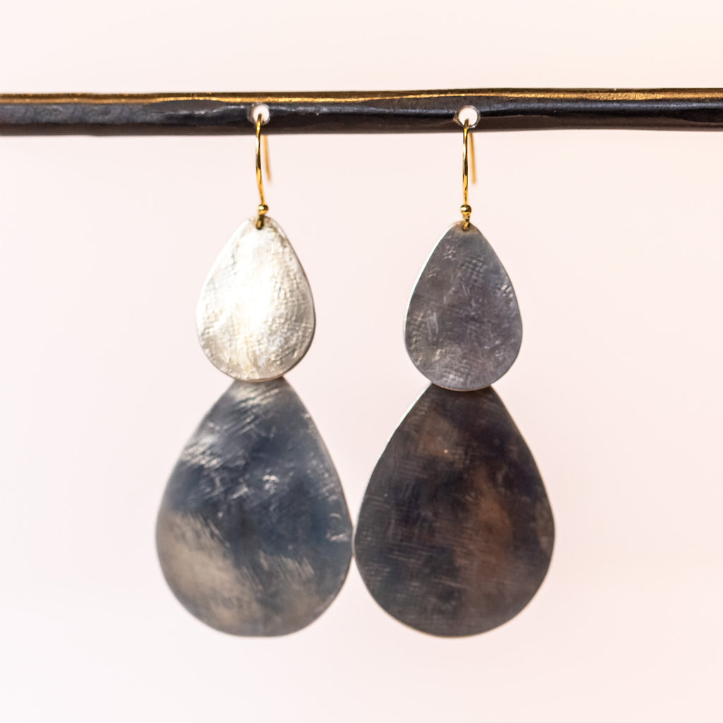 With their movement and dimension, these sterling silver teardrop earrings bring an artful touch to any look. Each teardrop is textured with an antique hammer for a parchment-like effect, creating a soft, organic shimmer. A spine of 18k gold connects the drops, adding warmth and a hint of contrast, while subtle movement gives them an almost weightless feel. Finished with 18k gold ear wires, these gold drop earrings are a modern take on timeless craftsmanship—perfect for those who love unique jewelry with an understated elegance.