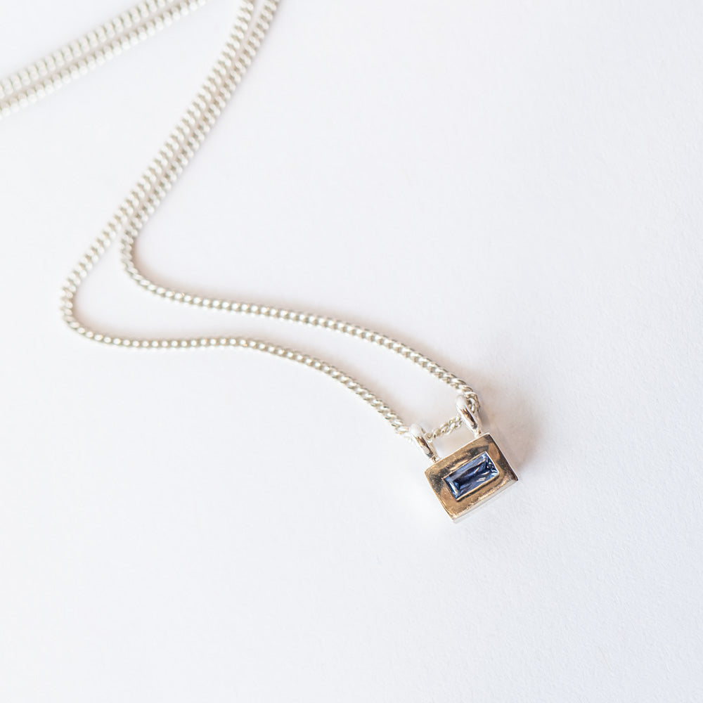 Baguette sapphire bezel set in a sterling silver sliding pendant necklace setting.