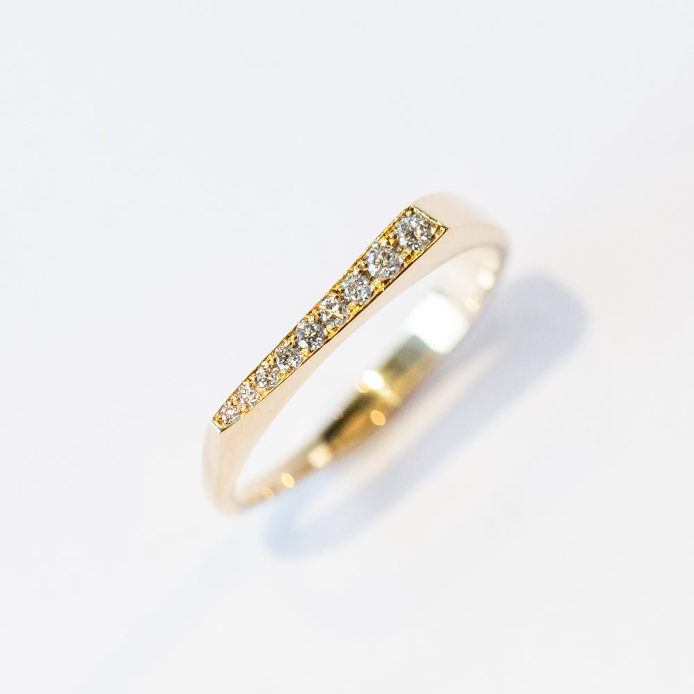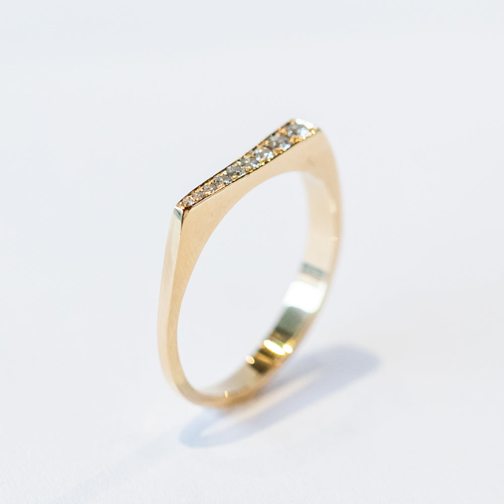 Add this slice of sparkle to your ring stack for a little something extra. Handcrafted in polished 14 karat yellow gold, this asymmetrical diamond ring features a row of graduated white diamonds along its flat top to really catch the light. Use it as a wedding band, wear it alone, or as a stacking ring with others from your collection.