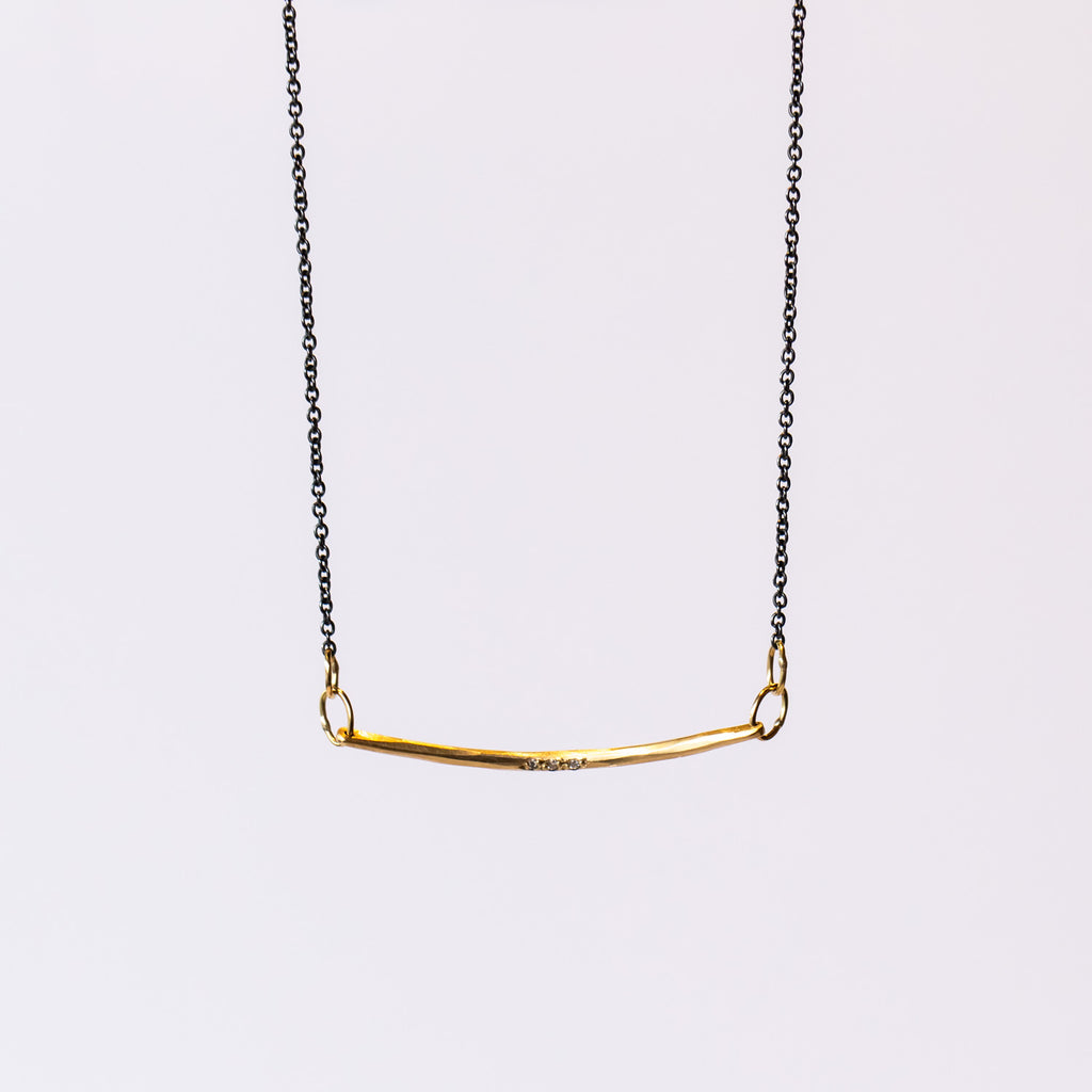 Give your jewelry collection a modern upgrade with Sarah McGuire's pave swing necklace. Suspended at the center of an oxidized silver chain hangs a delicate 18k yellow gold bar set with three petite white diamonds for just a hint of sparkle. Super wearable and yet a simple statement, this everyday mixed metal necklace does it all.