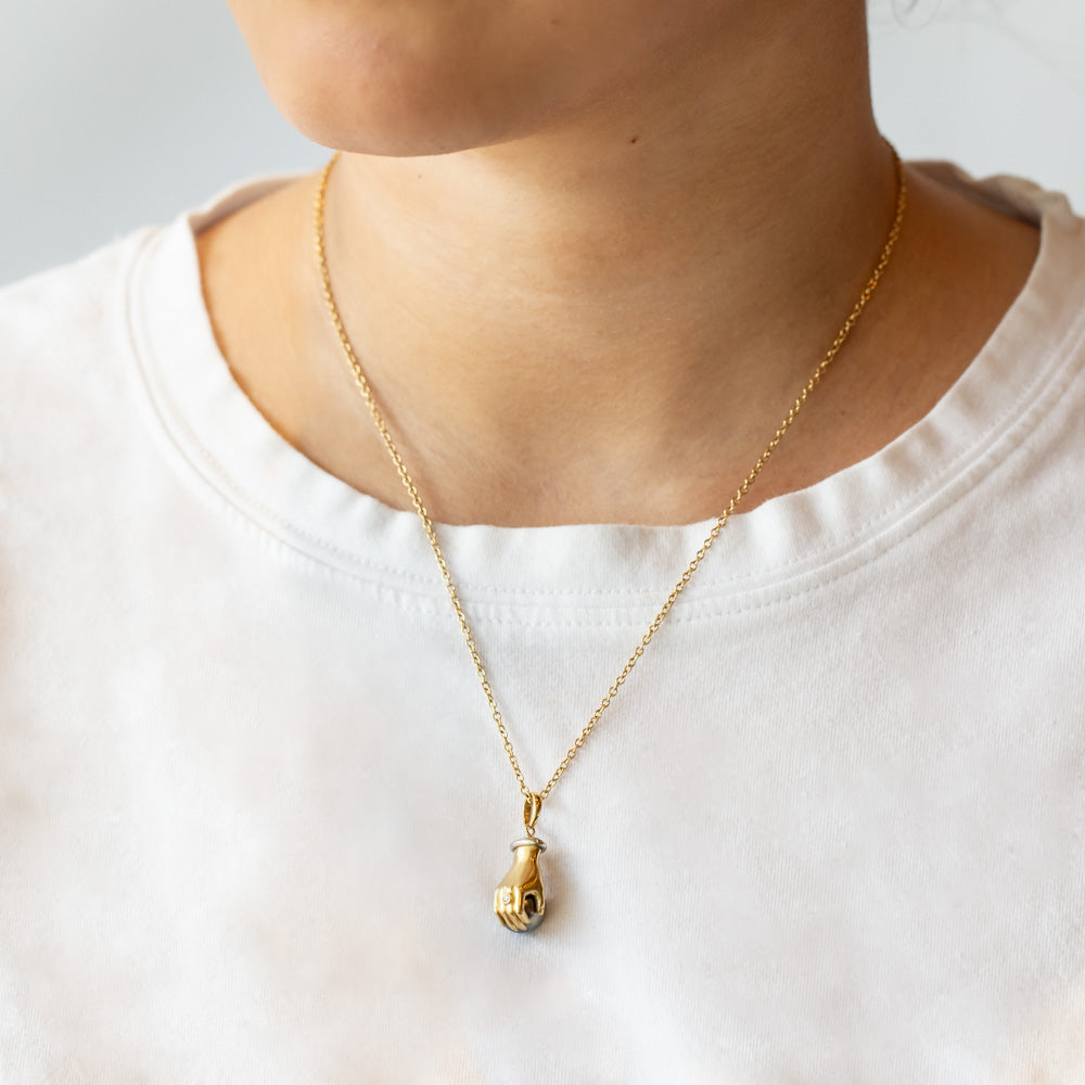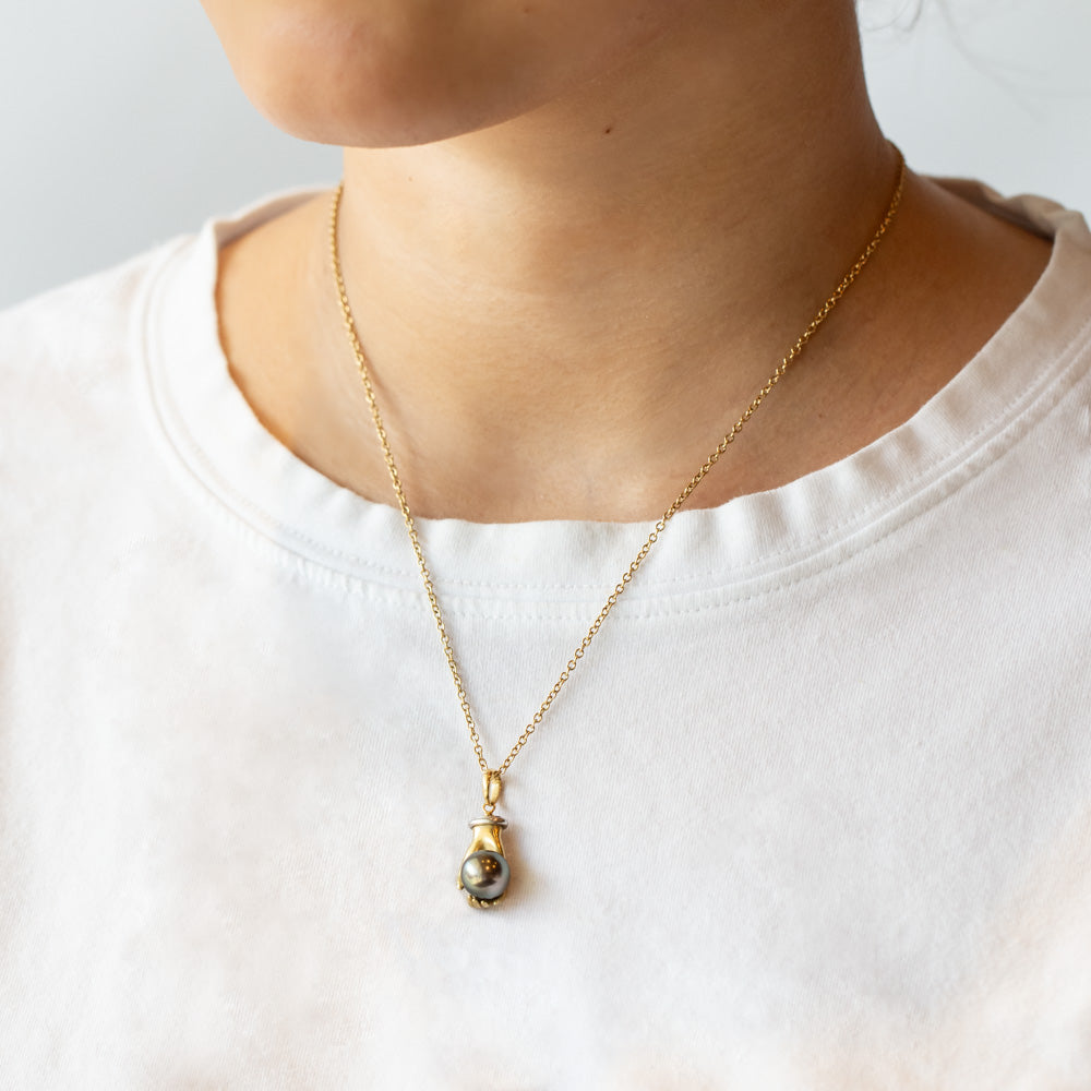 The hand is one of the earliest images of humankind, a symbol that marks our first appearance in the world and persists as an enduring definition of identity. Hands — along with other anatomical motifs — occurred frequently in the jewelry of the Greeks and Romans. Designer Anthony Lent's hand motifs were prompted by these influences from the past as well as Tony's fascination with miniature worlds. In this uniquely beautiful pendant, a carved yellow gold hand, accented with white gold, holds a generous black Tahitian pearl. A tiny white diamond is set into the finger on the back. The pendant hangs from a substantial yellow gold cable chain.