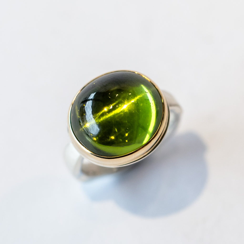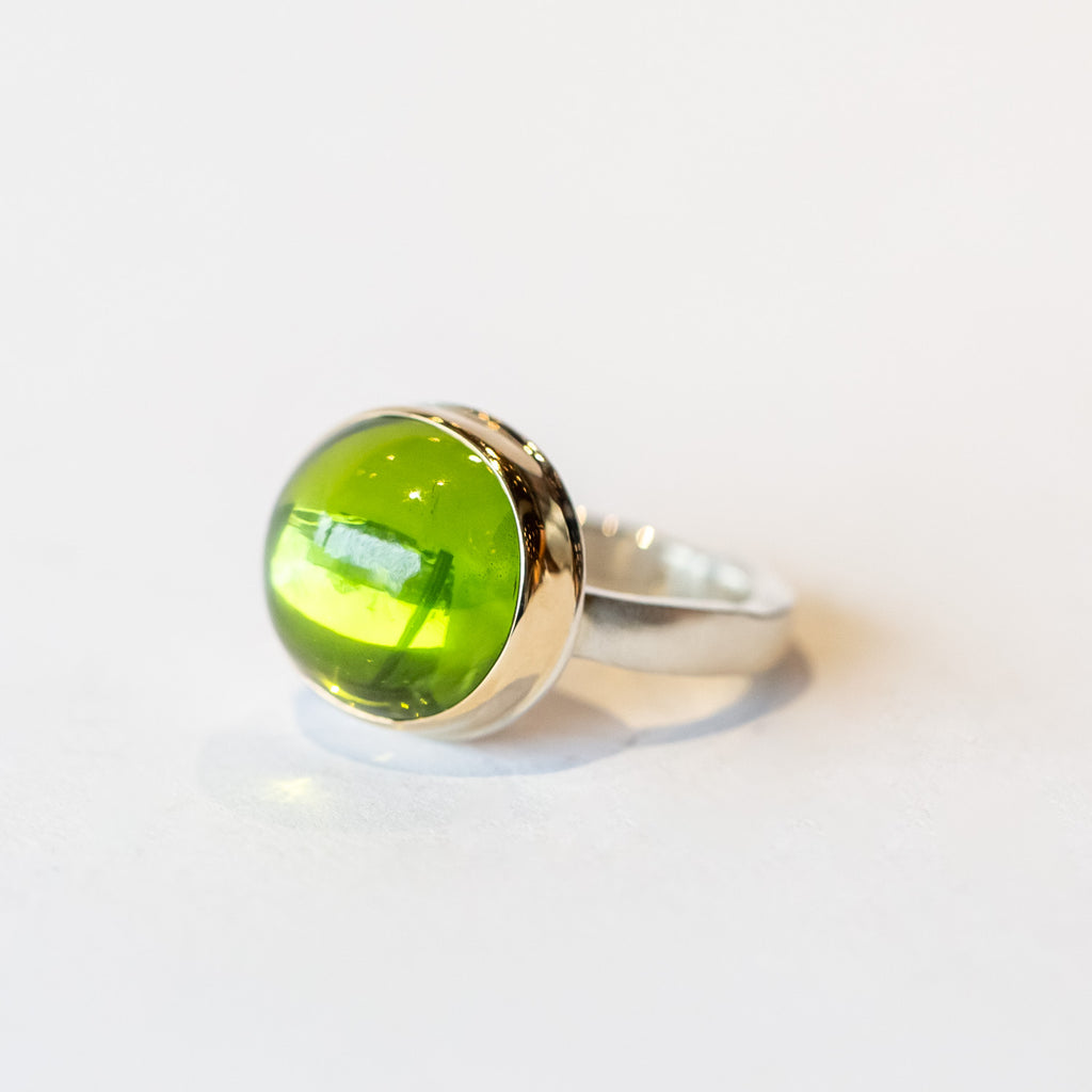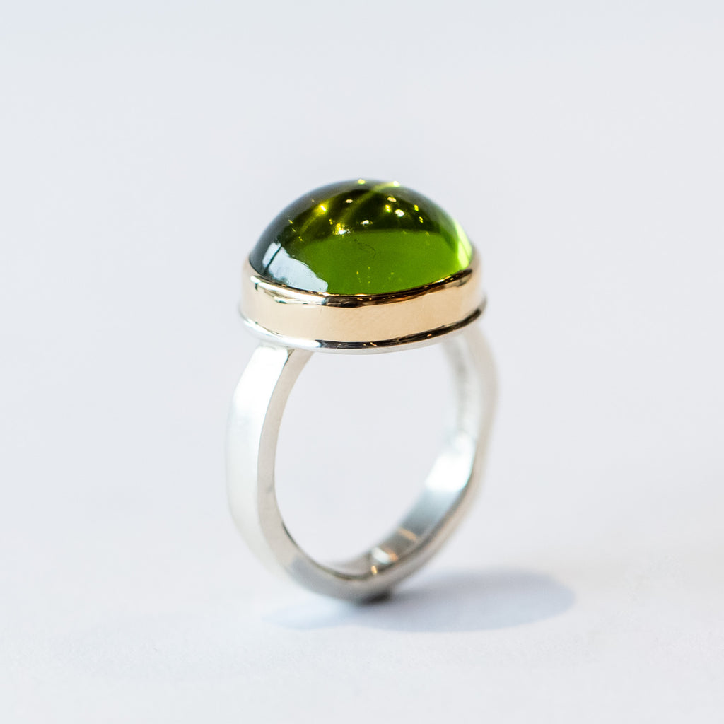 Smooth cabochon oval peridot ring bezel set in 14k yellow gold and sterling silver