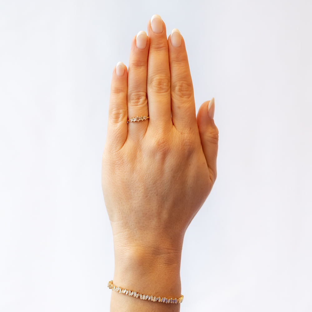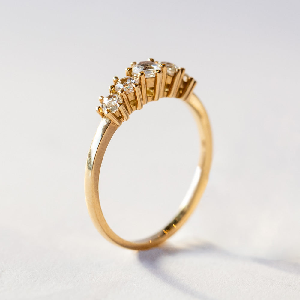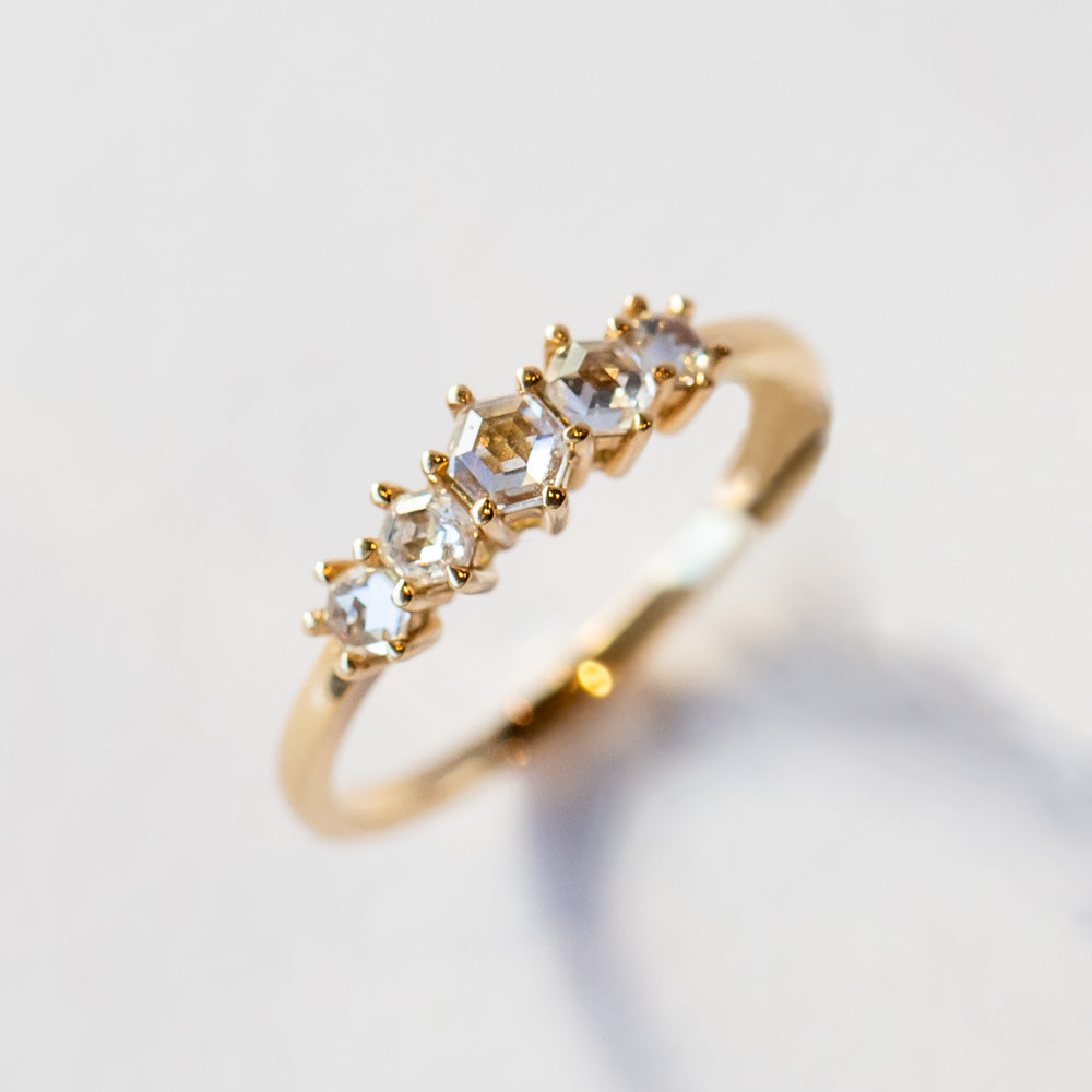 The Quincy Five Stone Ring is where modern design meets timeless charm. Featuring .55 carats of hexagonal rose cut diamonds, each stone is prong-set in rich 18k yellow gold, giving this ring a fresh, geometric twist. The hexagon diamonds add a unique flair, making it perfect for those who love a little edge with their sparkle.