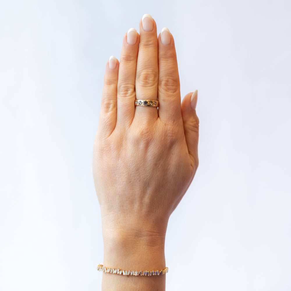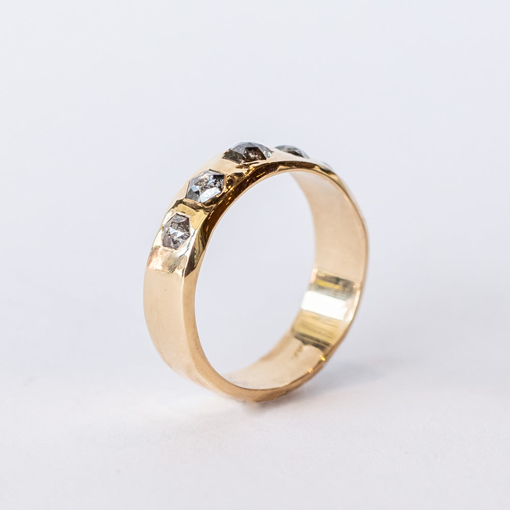 Cast your style spell with this chunky gold look. Five hexagonal rose-cut salt and pepper diamonds are flush-set into a wide 14k yellow gold band, blending earthy intrigue with undeniable sophistication. Salt and pepper diamonds are all about embracing uniqueness—each one tells its own moody, magical story. The hexagon shape? It’s a nod to harmony and balance, while the warm yellow gold gives it a radiant, grounded vibe. Wear this as a power piece or your go-to for effortless, everyday glamour. Either way, it’s a love letter to being unapologetically you.
