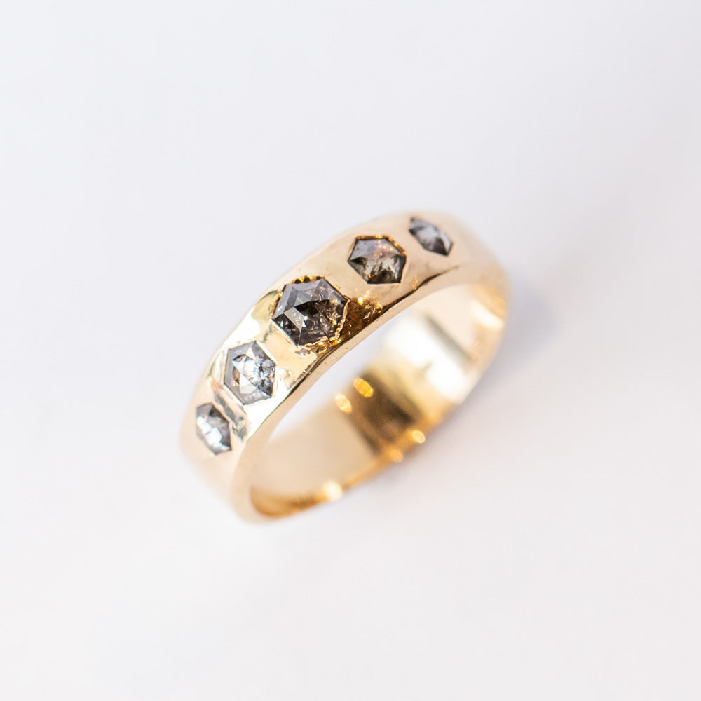 Five hexagonal rose cut salt and pepper diamonds flush set in 14k yellow gold