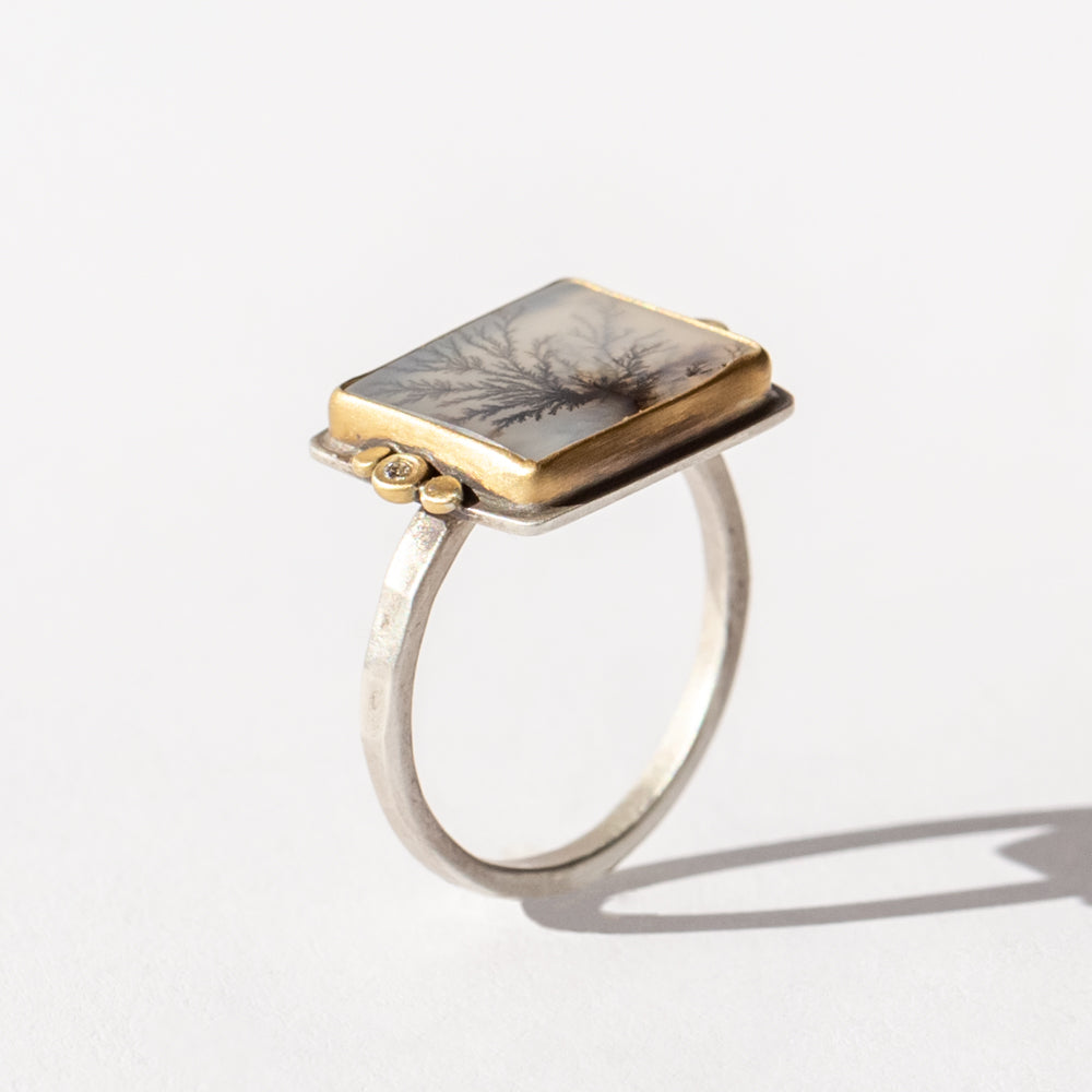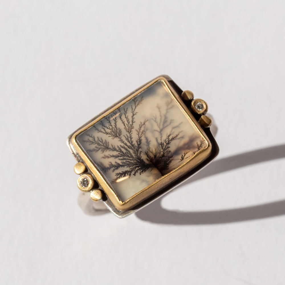 Ananda Khalsa | Rectangle Dendritic Agate Ring with Two Diamond Dots