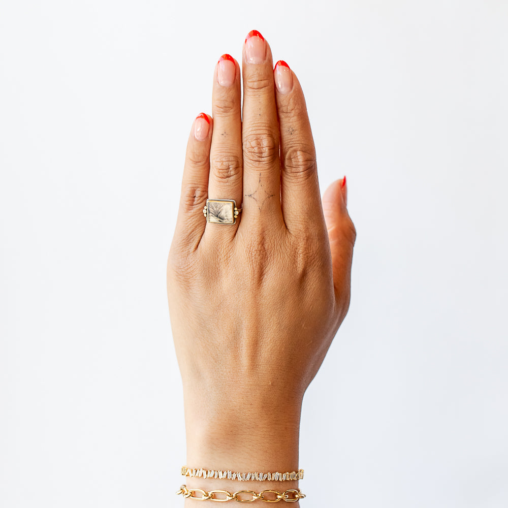 This ring is giving serious “one-of-a-kind treasure you’ll never want to take off” energy. The dendritic agate—known for its mesmerizing, nature-inspired inclusions—looks like a tiny, wearable tree, framed in a rich 22k gold bezel. Set horizontally for a fresh, modern feel, this beauty is accented with two diamond dots and delicate gold details, adding just the right amount of sparkle.
