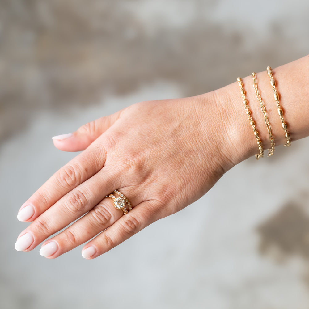Beautifully mixing tradition and modern style, this gold chain Rosary bracelet from Single Stone is the perfect addition to any bracelet stack. Handcrafted from 18 karat yellow gold, these spherical links are super smooth to the touch, with a nice weight on the wrist. Finished with a gold lobster claw clasp.