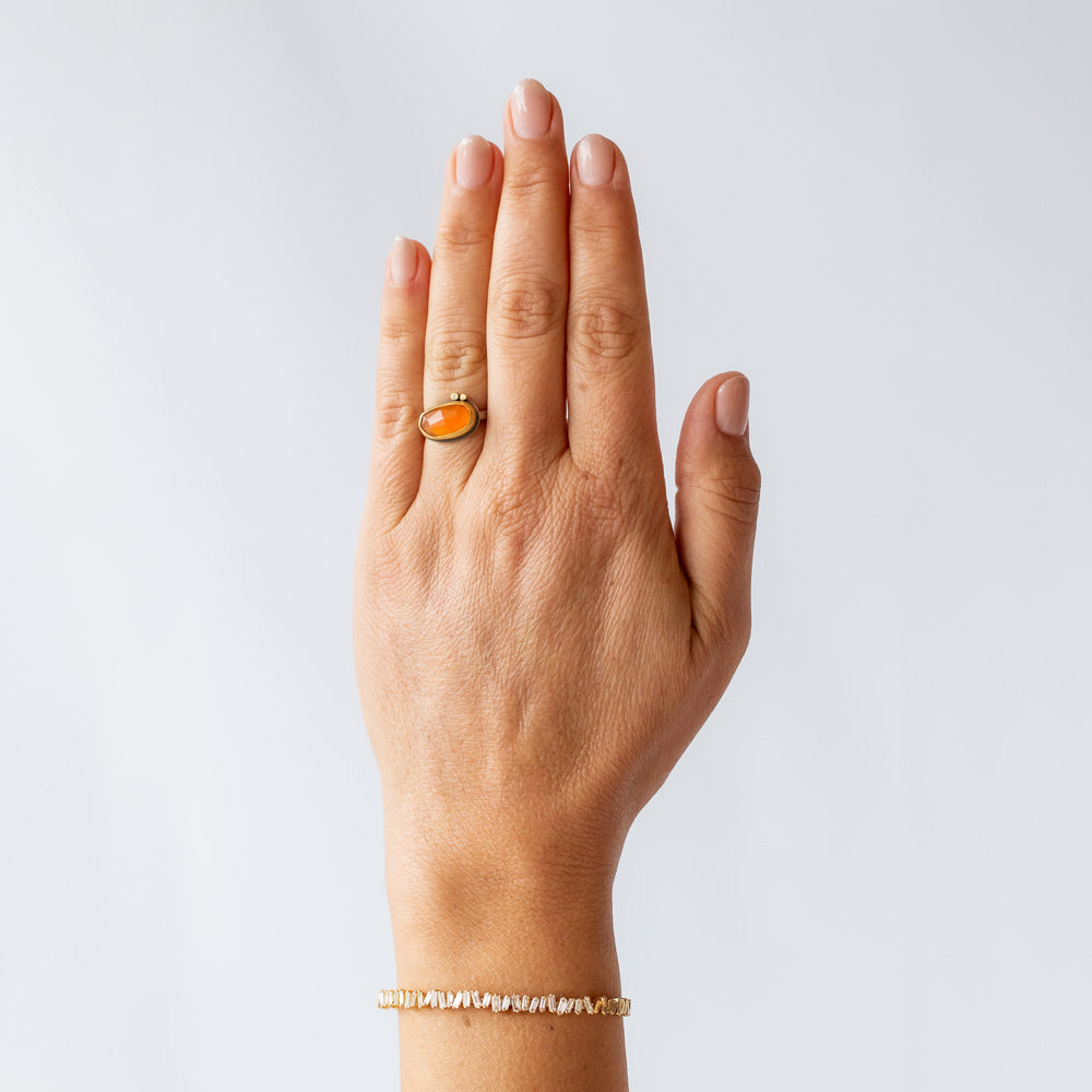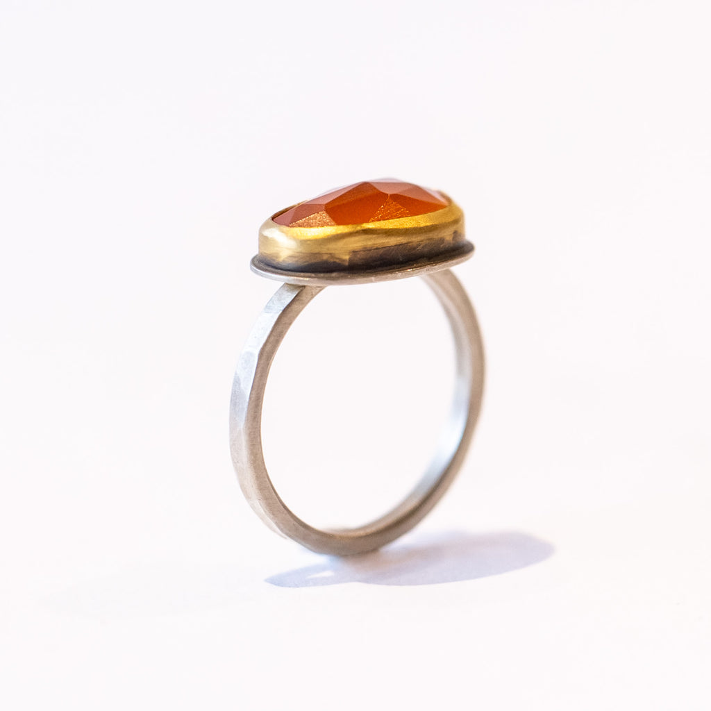 Rose cut orange carnelian ring bezel set in 22k yellow gold on a sterling band