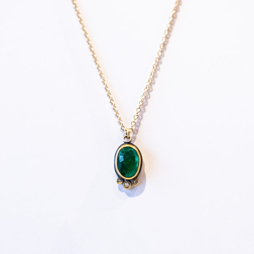 Oval rose cut emerald necklace bezel set in 22k yellow gold with three tiny white diamonds