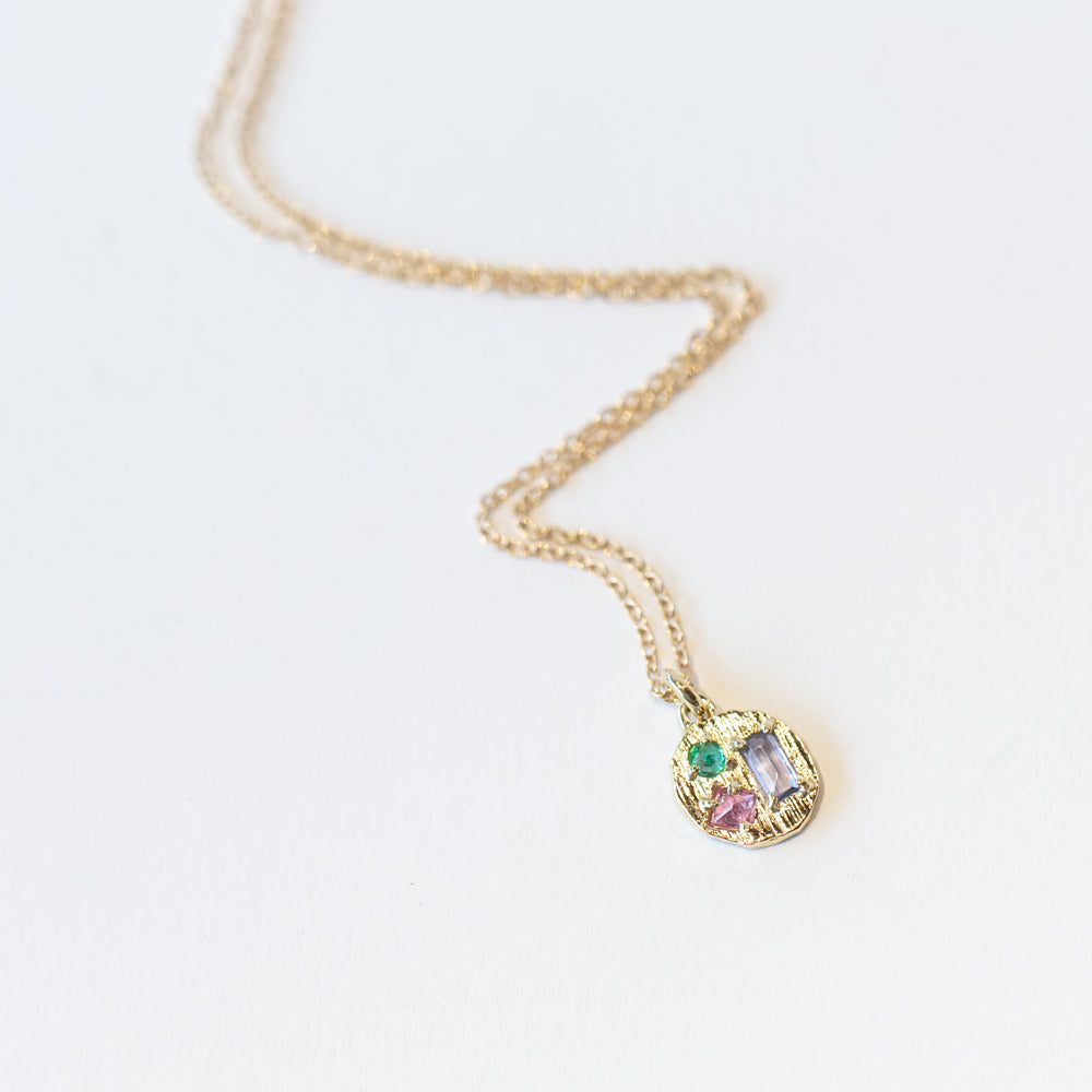This 14k yellow gold necklace brings an effortless mix of texture and color to your everyday lineup. The round pendant features a hand-carved, organic finish, giving it a beautiful artisan feel—like a little treasure unearthed from another time. Nestled within the textured gold, three prong-set gemstones—soft tanzanite, lush green emerald, and light pink sapphire—add a playful contrast of hues. Suspended from a delicate 16-inch chain, this piece is understated yet full of personality, perfect for layering or wearing on its own when you want just a hint of color and shine.