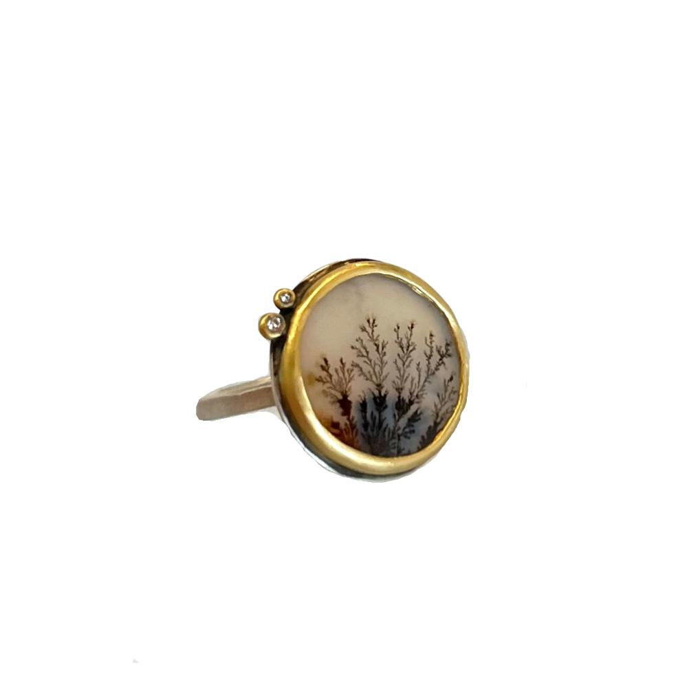 Round dendritic agate set in sterling silver with 22k yellow gold bezel