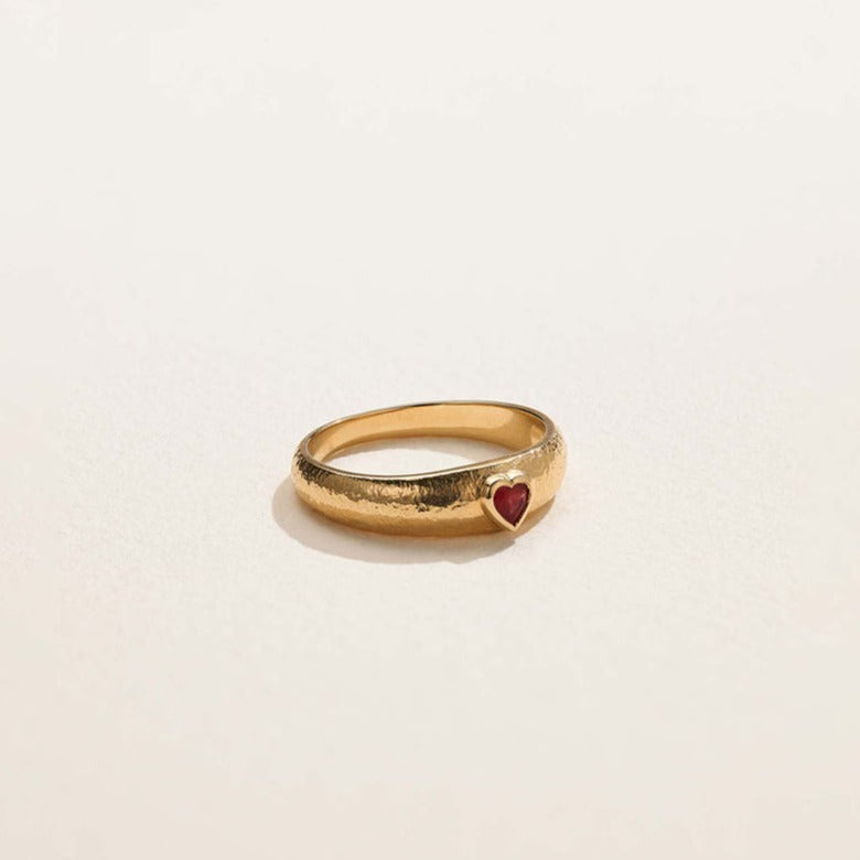 A bezel set ruby heart lays gently in this subtly tapered ring that expresses a sweet sentiment when worn solo and makes a statement when stacked.