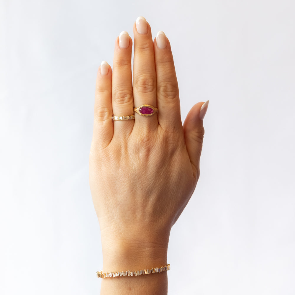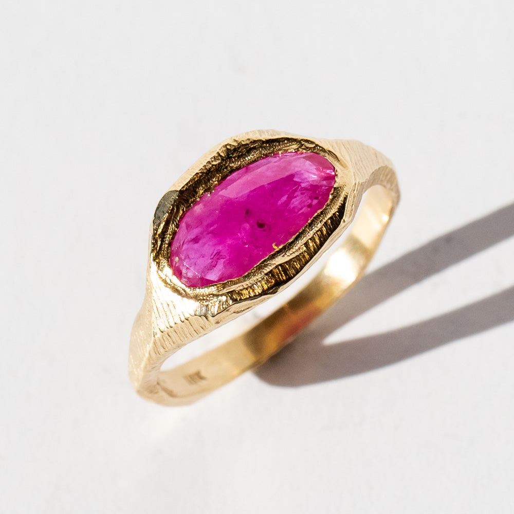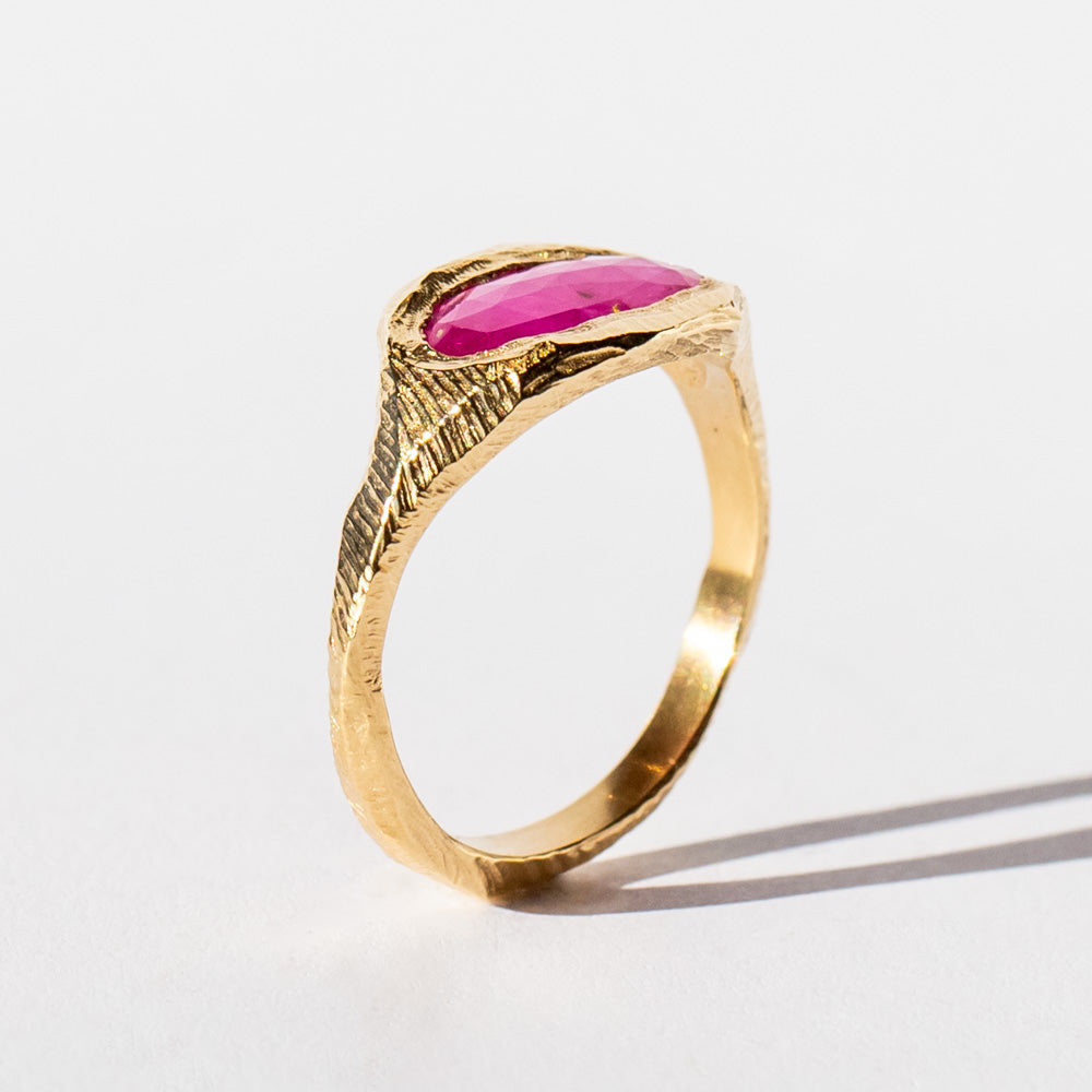 A bold, modern statement ring, ruby signet style features Page Sargisson's trademark textured cold for a look that exudes strength and sophistication. The rich, deep pink ruby catches the light beautifully, offering a captivating pop of color against the warm, textured gold band. Known as the birthstone for July, ruby symbolizes passion, vitality, and courage, making this ring a meaningful and powerful addition to your collection. With its low profile and luxury design, this signet ring is perfect for those who want something both bold and totally wearable.