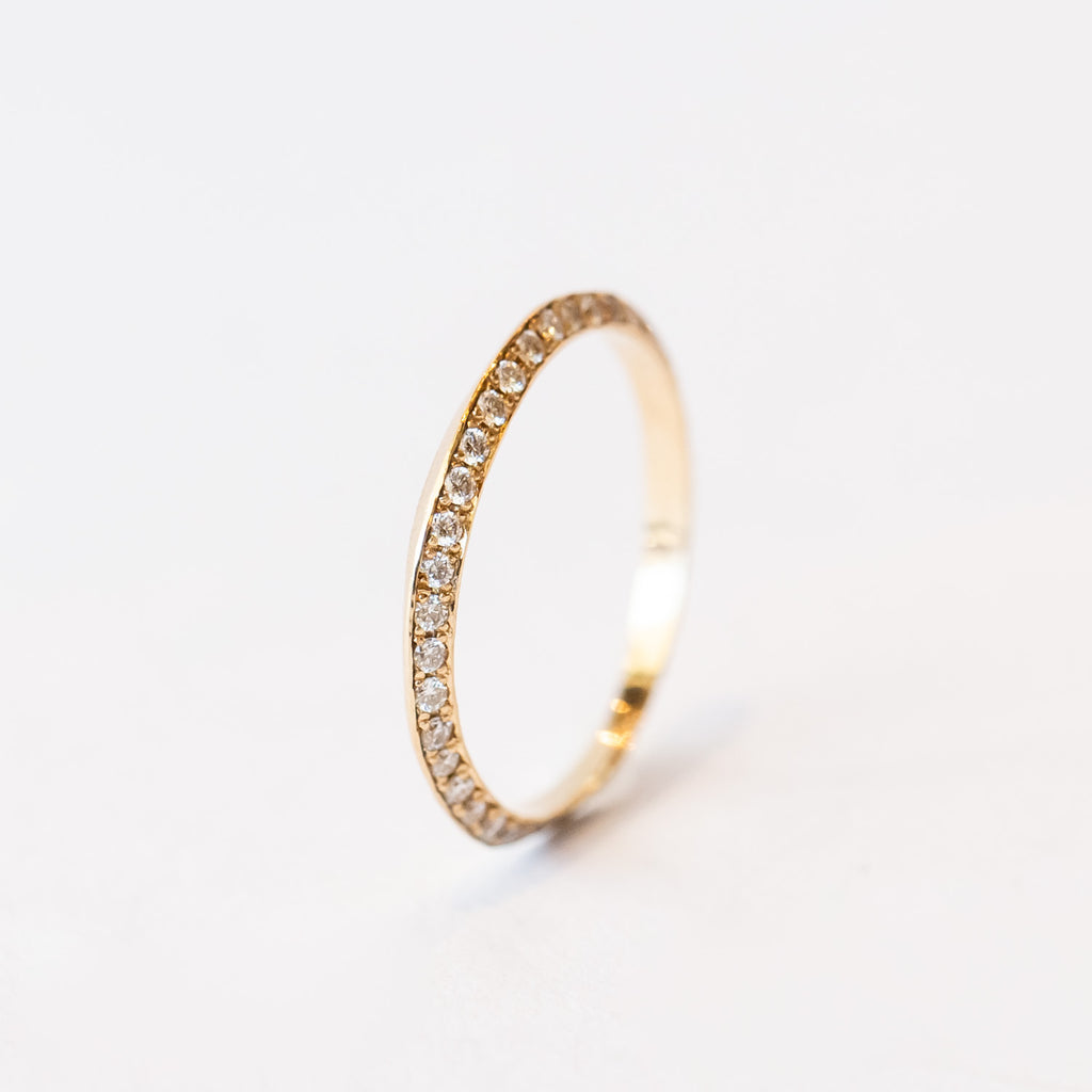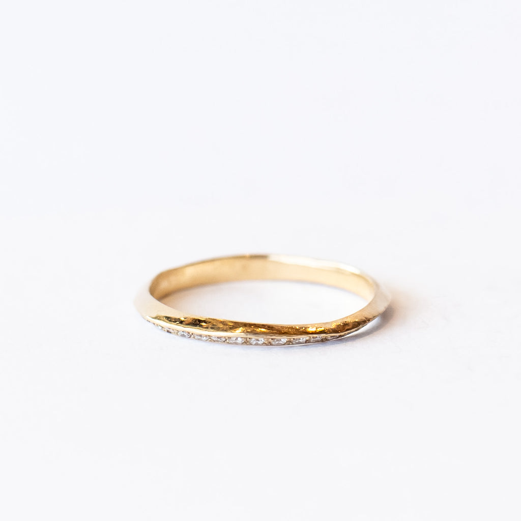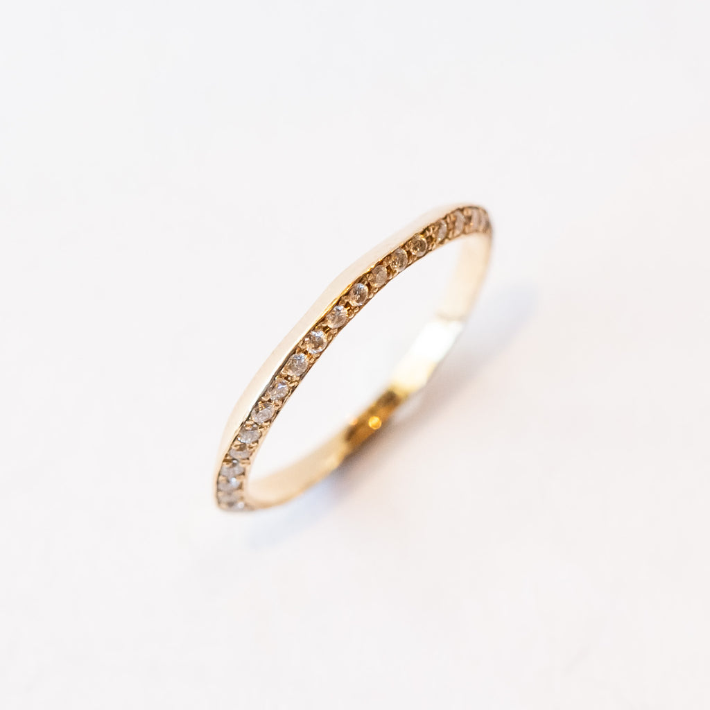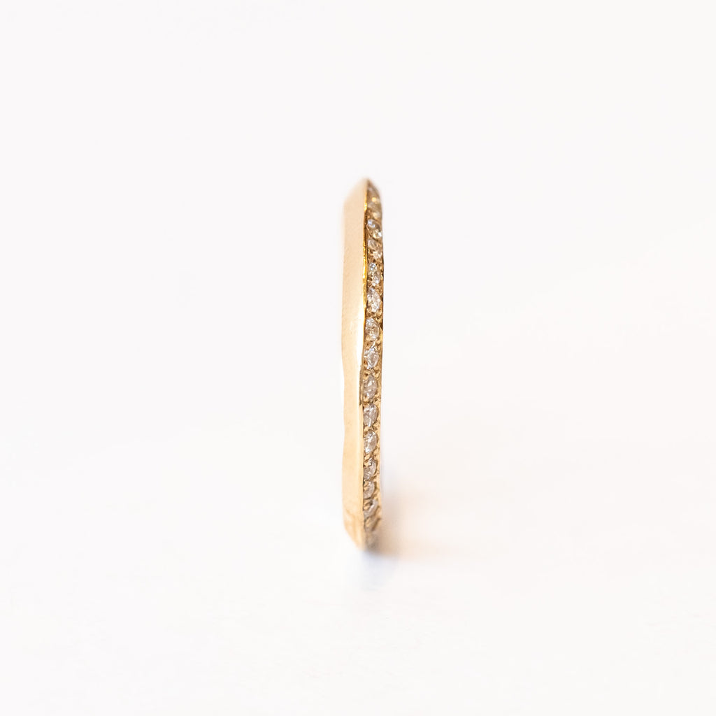 Stark and modern in style, this hand carved knife edge eternity band is set with pave white diamonds along a single side, offering surprising views. Wear it on its own, as a stacking ring, or with your engagement ring for a unique wedding band set.