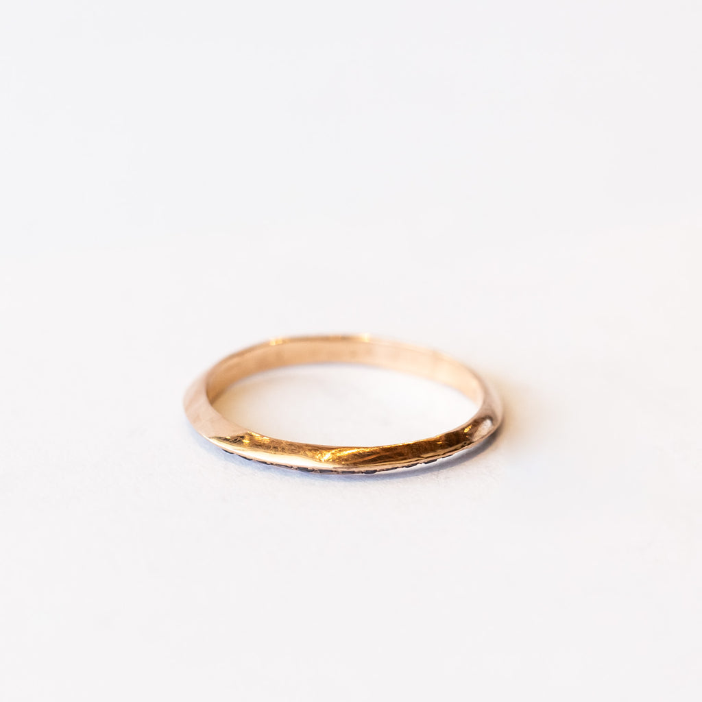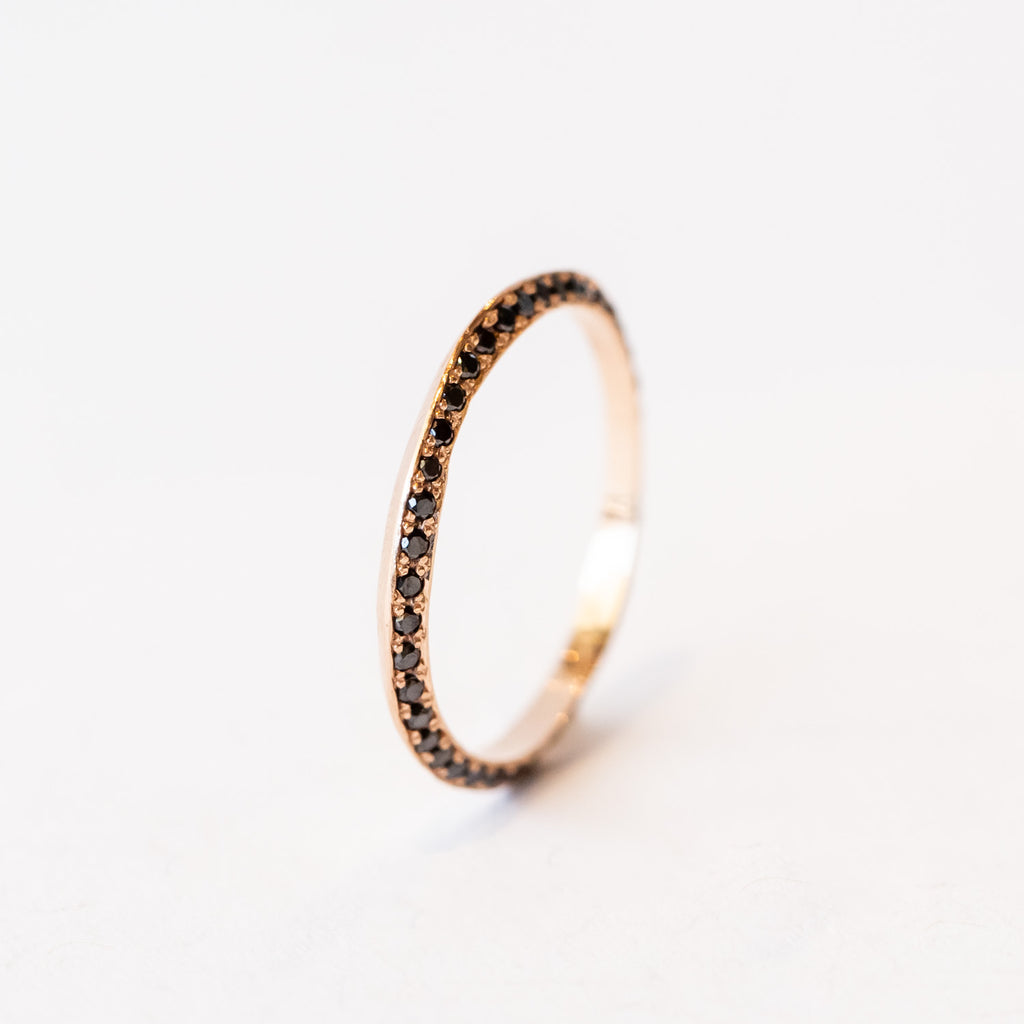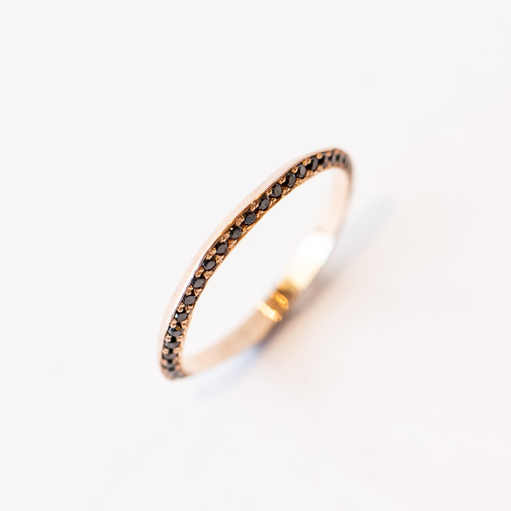With a nod to history and a modern edge, this black diamond eternity band is hand carved from 14 karat rose gold. Its knife edge surface is set with small black pave diamonds along just one side, offering a surprising look and subtle sparkle. Wear it alone, as a stacking ring, or as a unique wedding band.