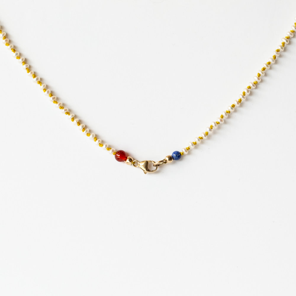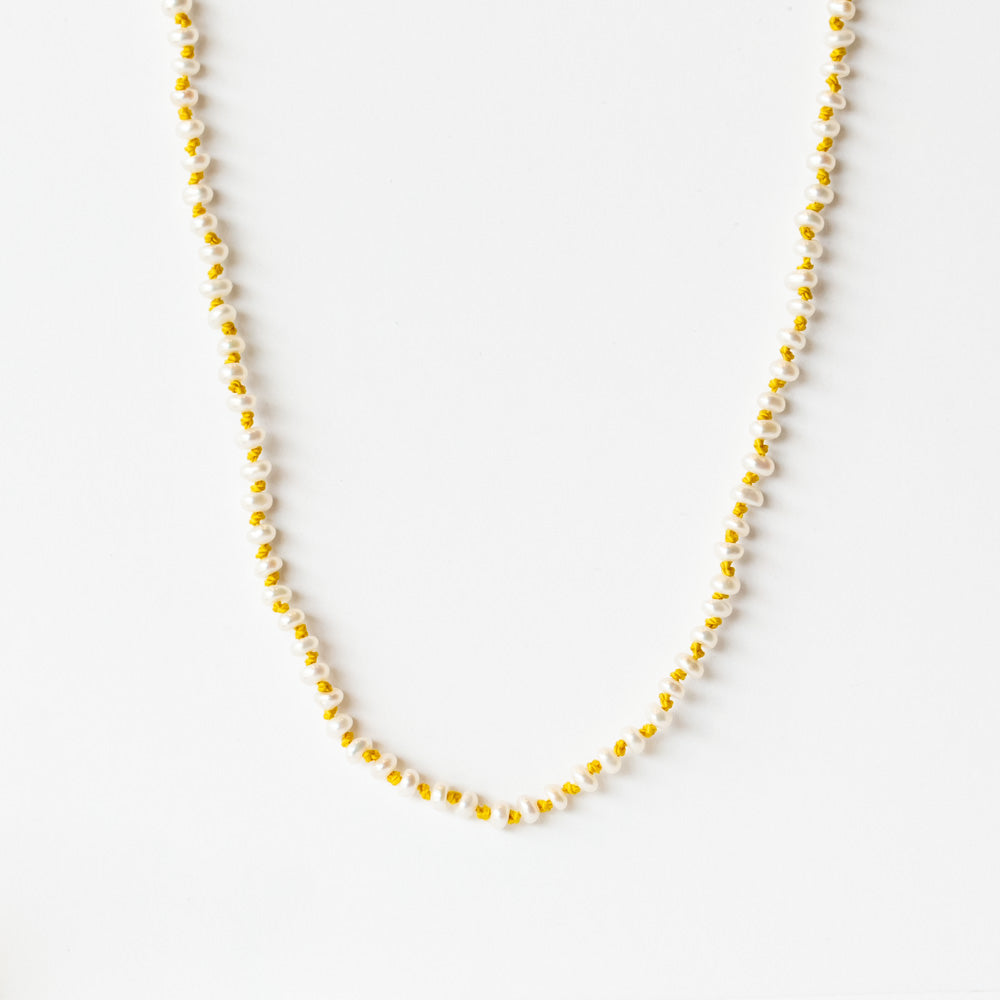 These delicate white seed pearls are threaded with vibrant yellow silk, creating a soft, classic elegance with a modern twist. The bright yellow silk adds a playful pop of color, making this piece feel fresh and fun. Finished with a sleek 14k yellow gold clasp, it adds just the right amount of shine. This necklace is the perfect balance of timeless beauty and contemporary style, effortlessly elevating any look. Wear it for a hint of glowing sophistication or add a pop of sunshine to your day.