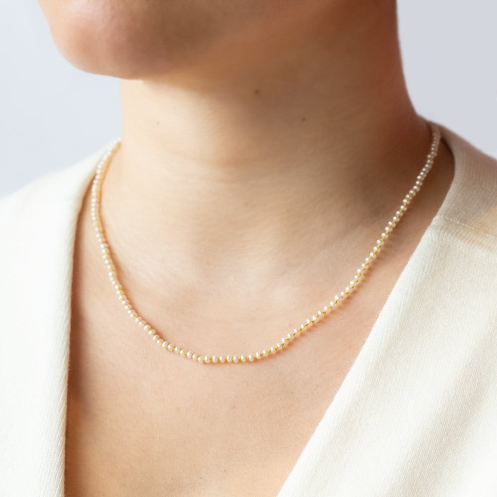 Seed pearls threaded with yellow silk and 14k yellow gold clasp.
