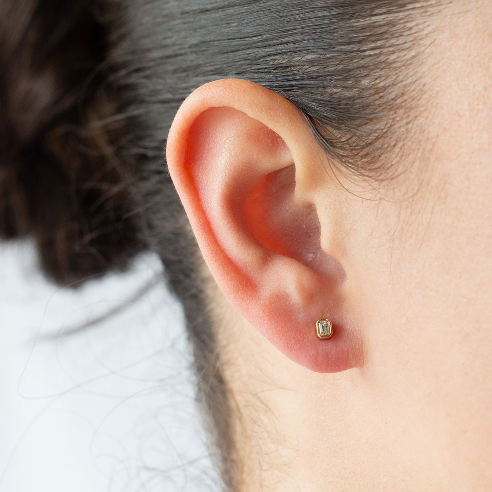 Dainty and sophisticated, these Sierra diamond stud earrings from Single Stone feature sweet little emerald cut diamonds set in handcrafted yellow gold bezels. They're perfect for everyday wear or wearing with other diamond earrings in a layered look if you have multiple piercings.