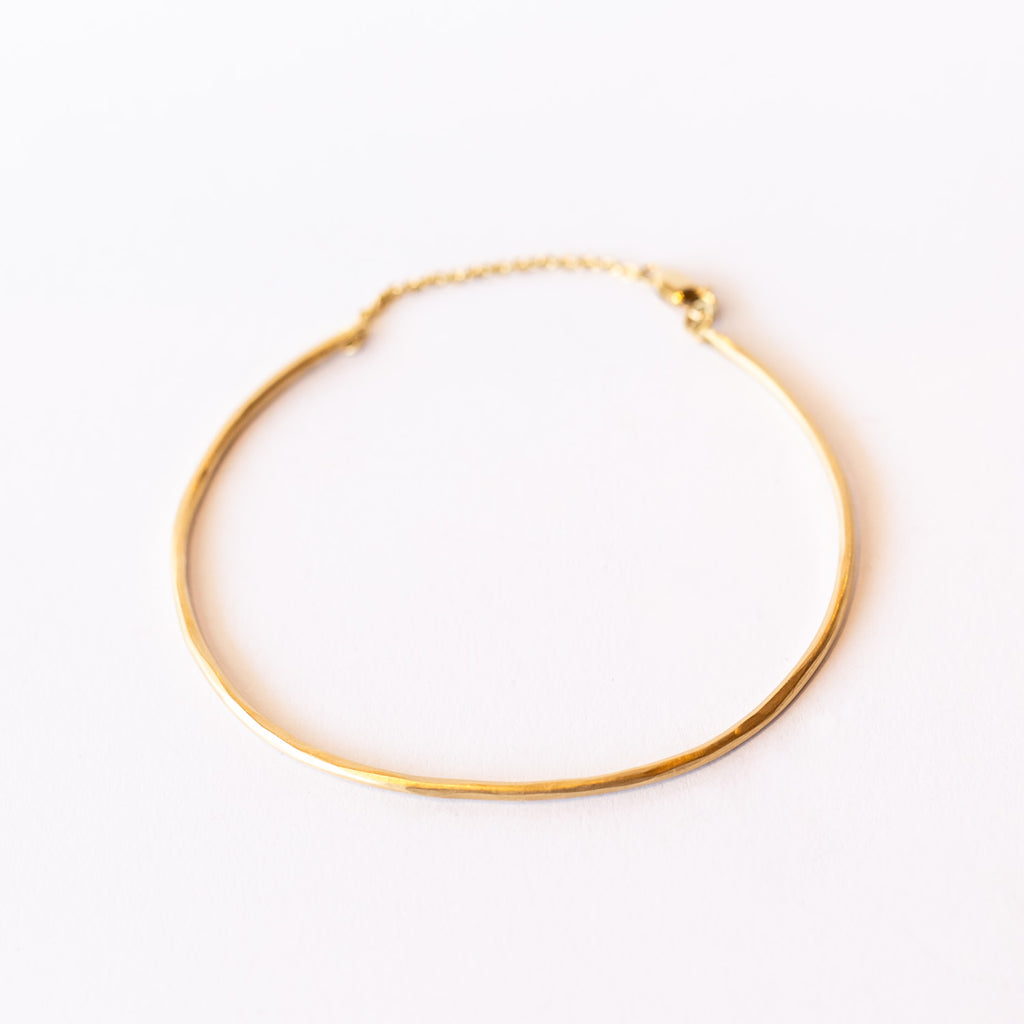 Delicate yet distinctive, this thin 18k yellow gold cuff bracelet is hand-textured for an organic, timeworn feel. A 14k gold chain closure adds a touch of movement, security, and unexpected detail, balancing elegance with a hint of edge. Lightweight and easy to wear, this piece is perfect for stacking or wearing solo as a subtle statement. Its refined, understated beauty makes it a timeless addition to any jewelry collection.