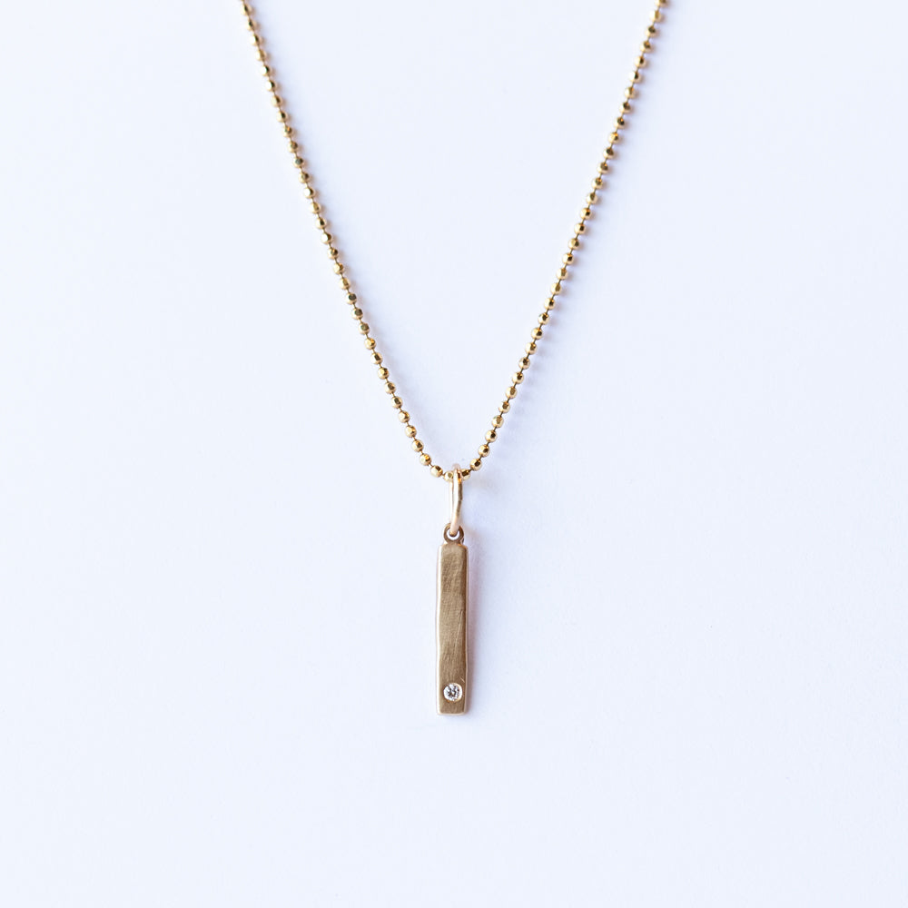 Minimal, but make it golden. This skinny vertical bar charm in solid 14k yellow gold is sleek, simple, and finished with a tiny diamond at the tip for just the right amount of sparkle. It’s giving quiet confidence and timeless layering energy.