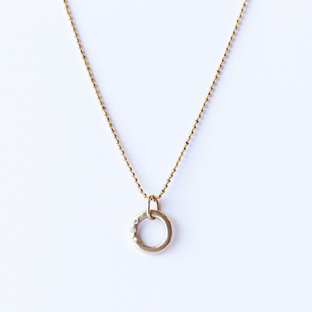 Whether you think of it as a sweet little symbol of connection or simply an everyday minimal accessory, this circle charm will work beautifully in your jewelry rotation. Handcrafted in solid 14k yellow gold, the open circle is dotted with three tiny diamonds for a touch of shimmer. Circles often represent unity, wholeness, and cycles—and we love how this one adds subtle sparkle to any charm stack.